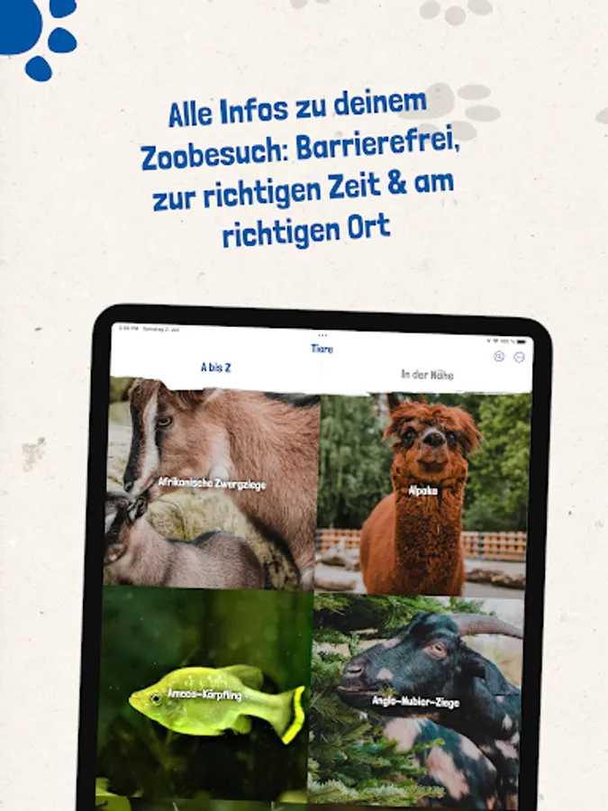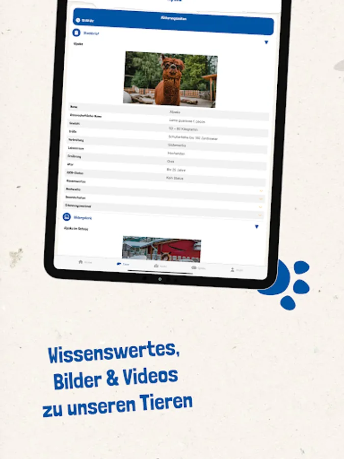 The Tierpark Bochum app makes a visit to the zoo an eventful experience for everyone, with and without disabilities, regardless of age, gender, social or ethnic background. It allows you to experience the world of animals with all available senses. With animals in augmented reality, guided tours, quiz questions and much more, the visitor playfully discovers the zoo and its diverse residents. Animal information is provided at the right time in the right place. All content is tailored to the individual needs of the various visitor groups and invites you to discover them, e.g. in the form of videos, audio guides, picture galleries or profiles.