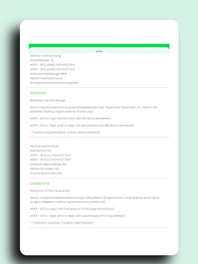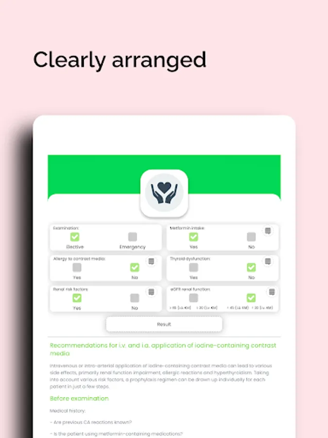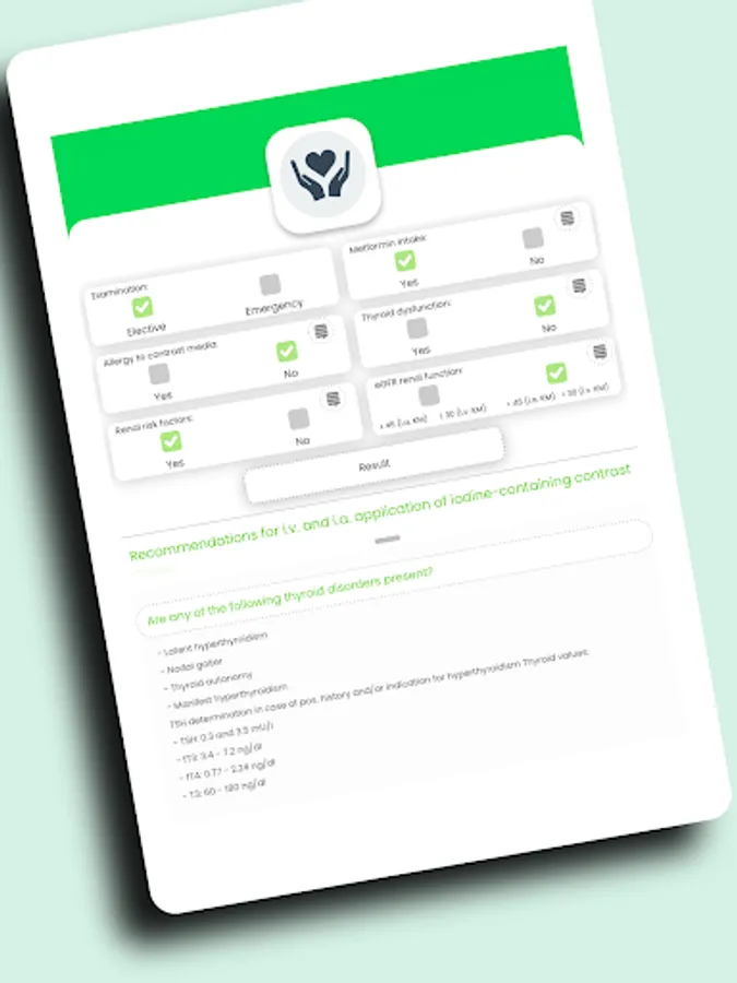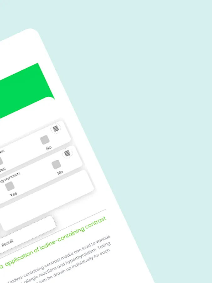 Intravenous or intra-arterial application of iodine-containing contrast agents may result in various side effects, including renal function impairment, allergic reactions, and hyperthyroidism. Taking into account the various risk factors, individual prophylaxis regimens can be established for each patient. The KM-Helper is intended as a training program to help patients practice the use of iodine-containing contrast media so that they can later identify high-risk patients in clinical routine in good time and, if necessary, initiate suitable corrective or protective measures.
