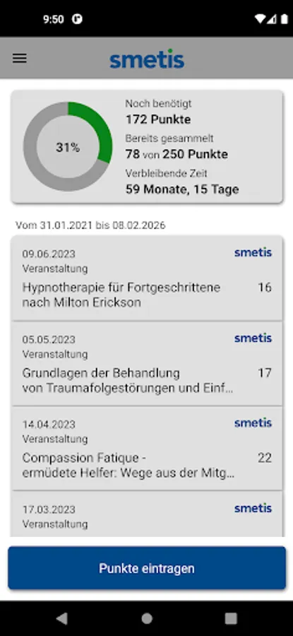 The smetis app is a useful addition to the smetis web portal for further training in the psychotherapeutic context. With the smetis app, you can easily get a quick overview of your continuing education points at any time. In addition, all of your certificates of participation stored in the portal are automatically available to you.