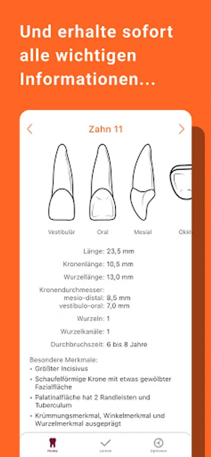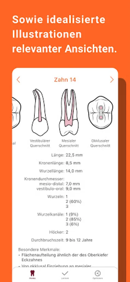 This app is used to study human tooth anatomy and is based on relevant literature. It is not intended to convey any medical diagnosis, recommendation, or calculation. If you have any medical questions about therapy, recommendations and diagnoses, please contact your dentist. For technical and content-related questions / comments, please use our contact links in the options.