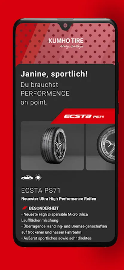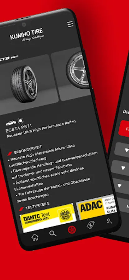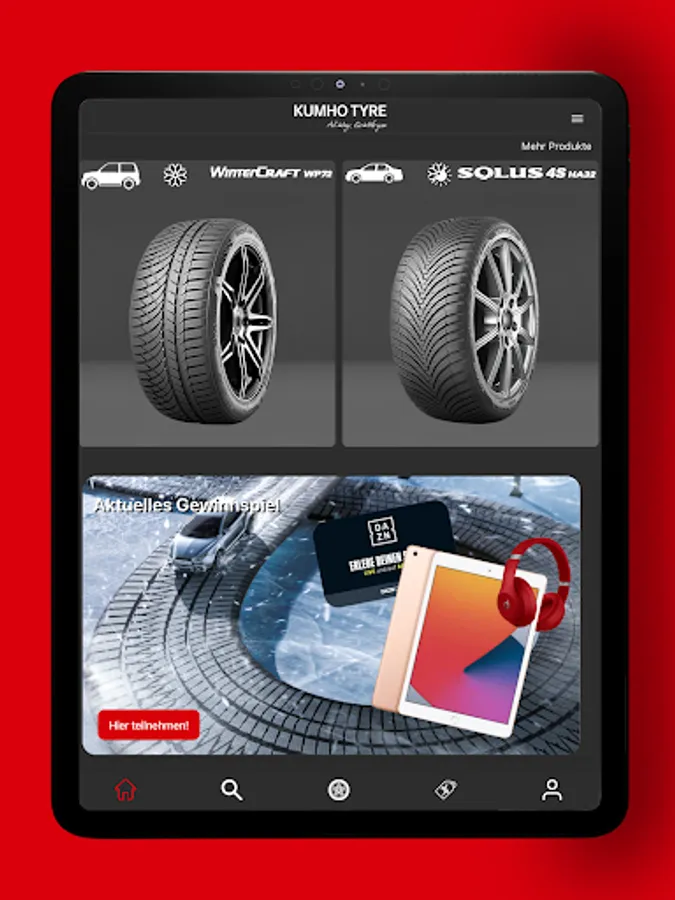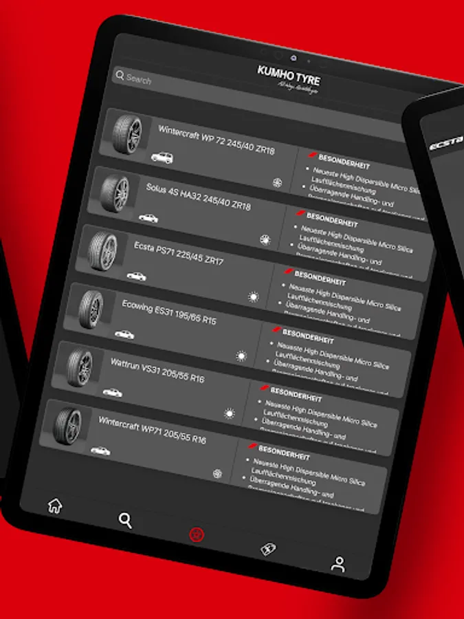 The Kumho App is the free mobile tyre app for the German market of the South Korean tyre manufacturer KUMHO TYRE. The app offers easy and quick access for dealers and consumers to current marketing promotions.