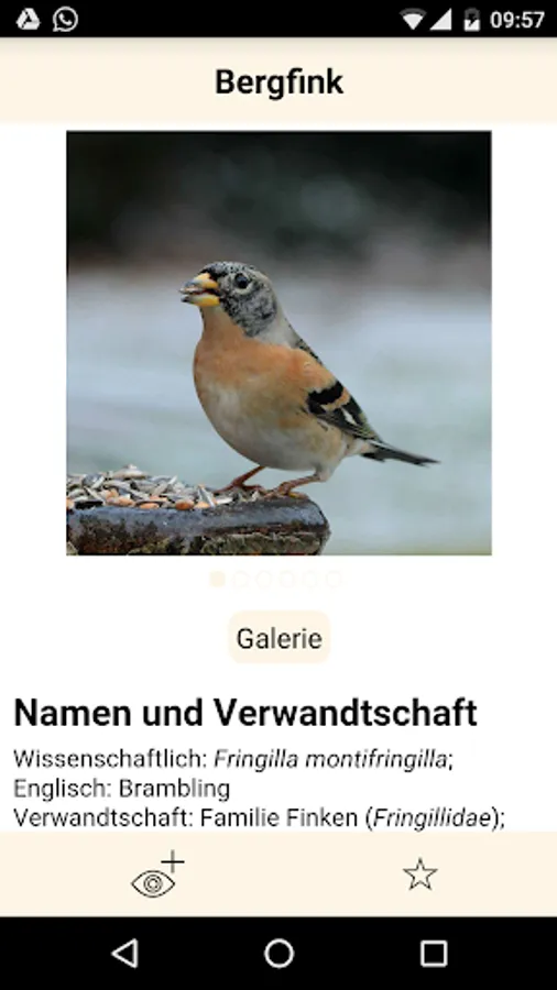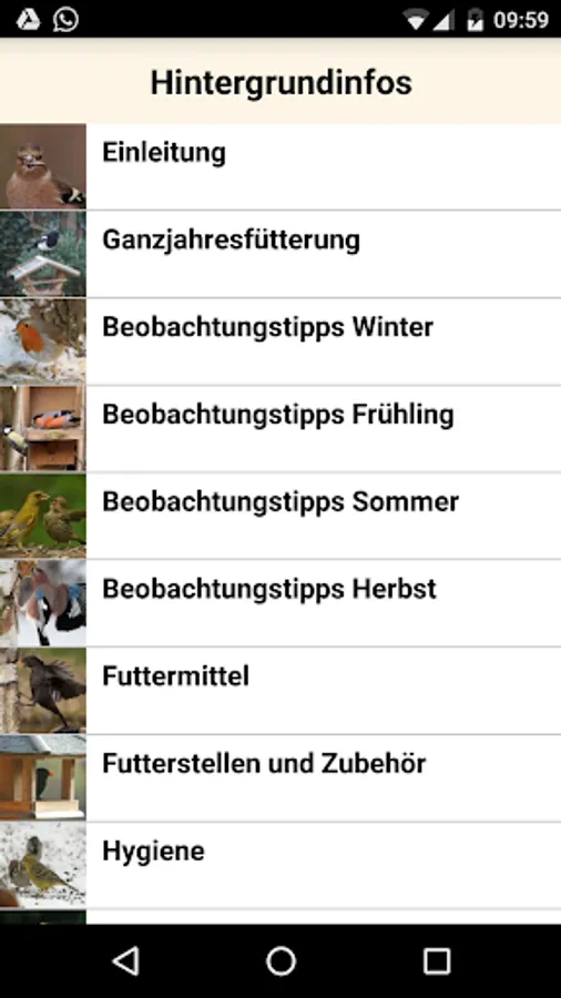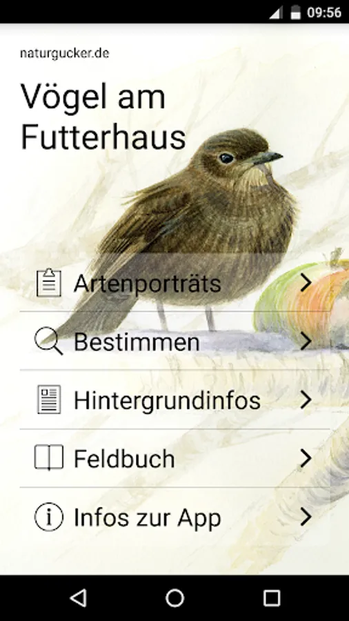 The app provides you with about 35 common birds that visit feeders and Co., detailed information and typical images. this Artporträts be supplemented by a provision assistance in the form of a fine selection key. About well recognizable features come so in the event that you do not immediately know what birds you are watching on your bird feeders, quickly became a striking selection of related species, said determining aid but only the species considered to be presented in the app in Artporträts ,