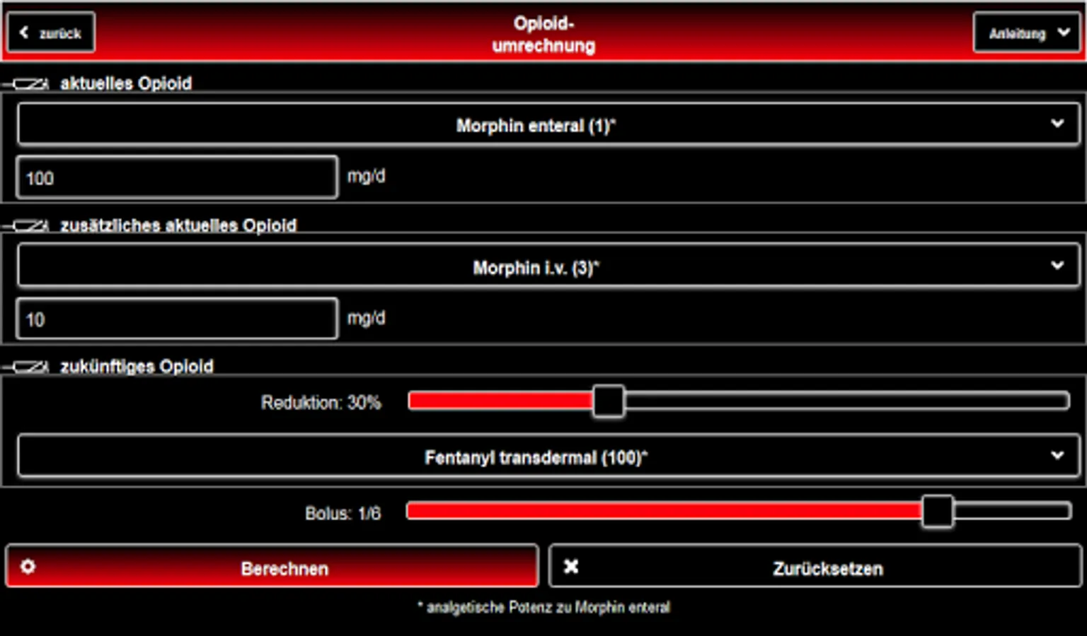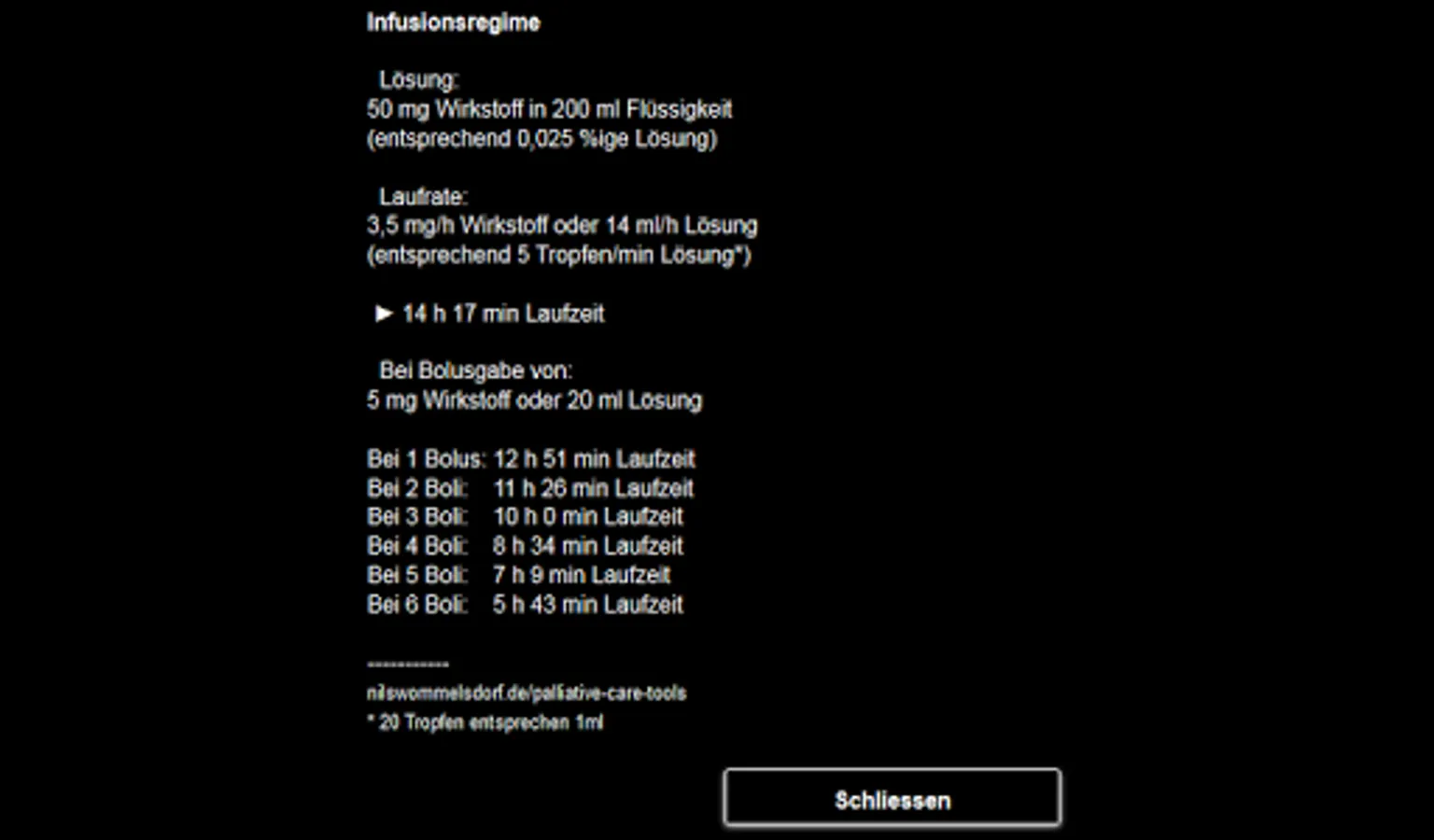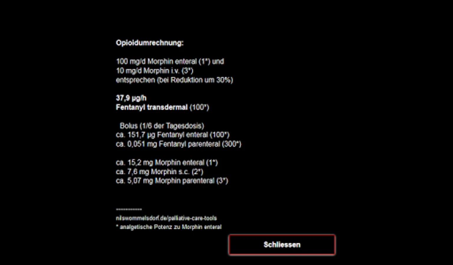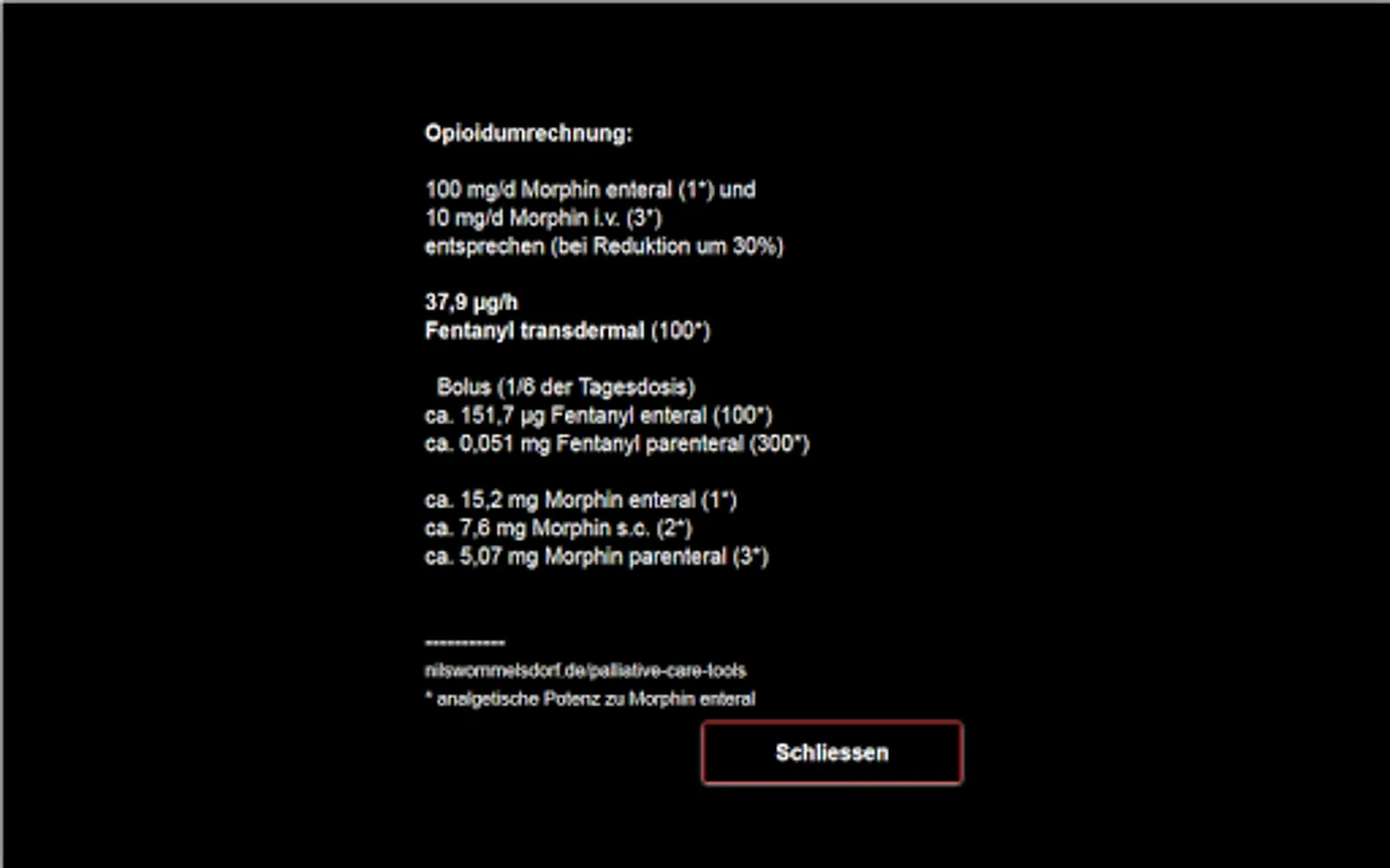 Conversion of opioids with bolus calculation (for breakthrough pain), calculation of infusions (calculation of dosage , duration rate , duration, bolus doses and with dropclicker) and conversion of corticosteroids in one tool . Portable for daily work (not only) in the palliative and oncological care for physician and nursing.