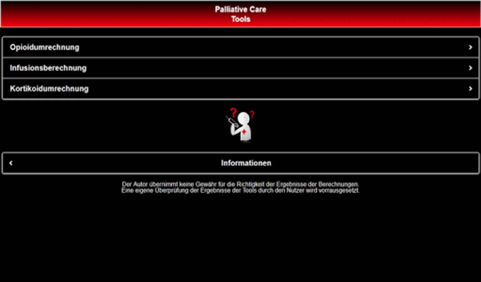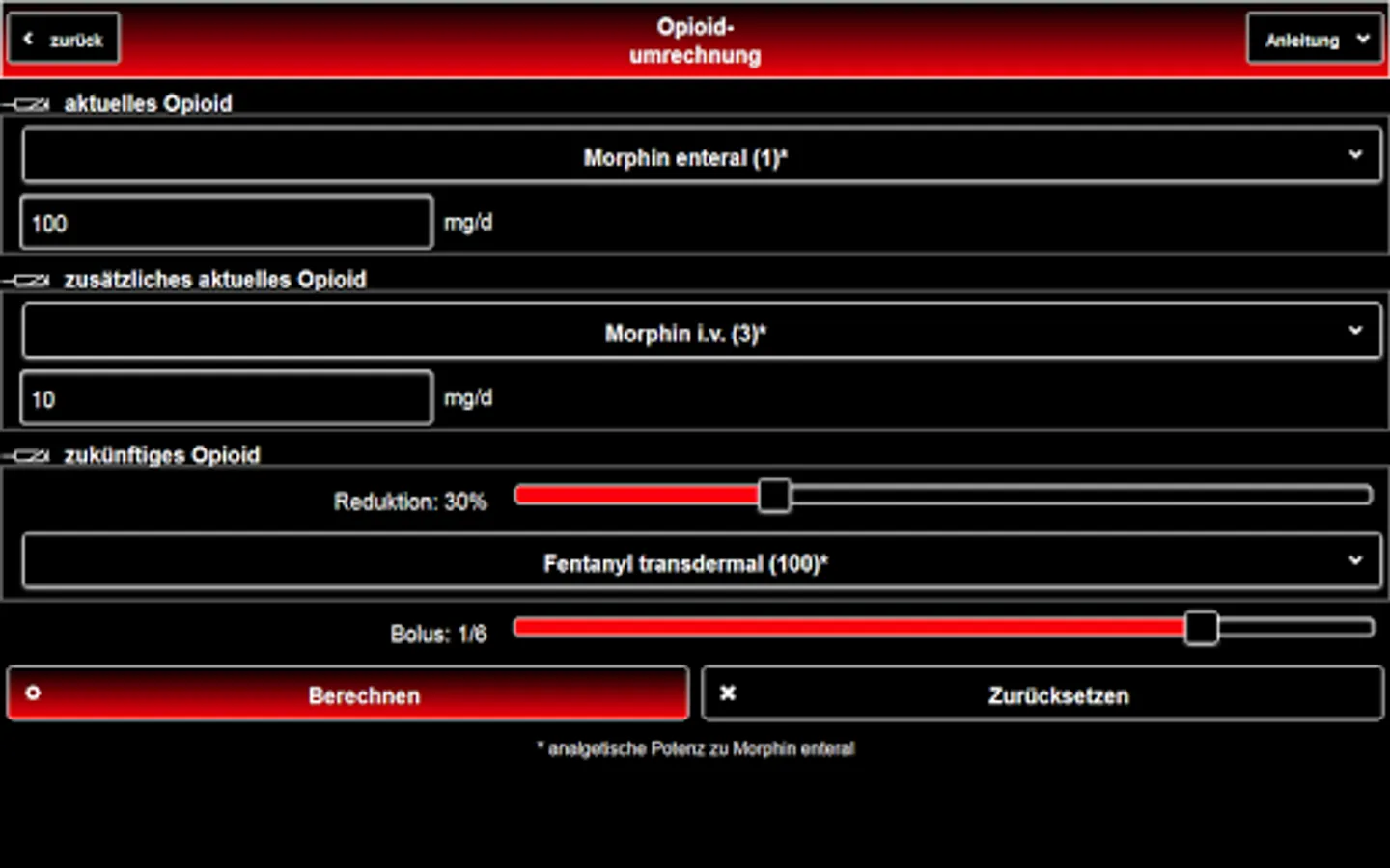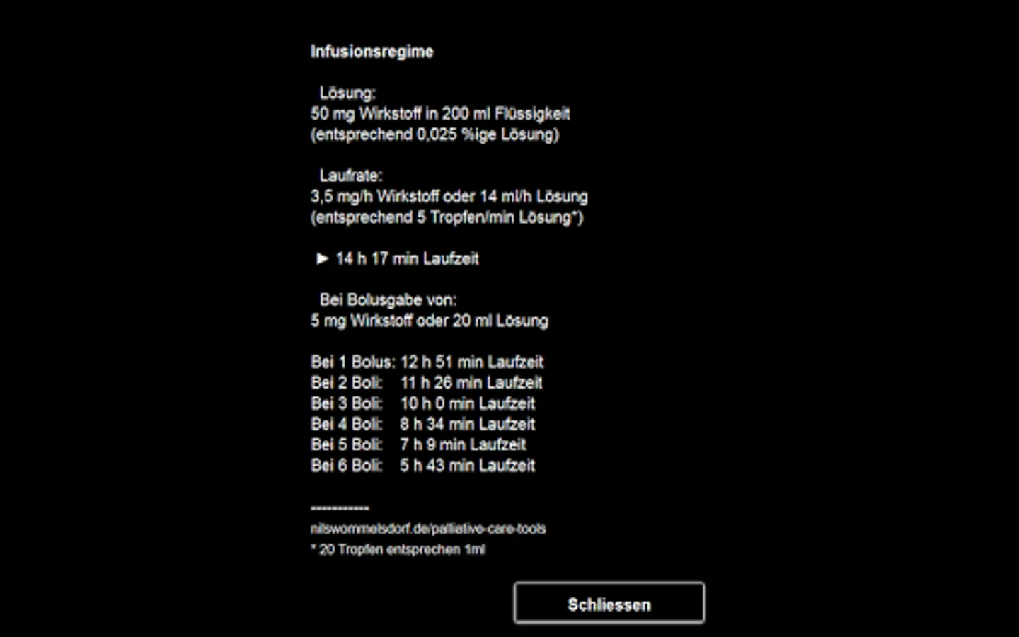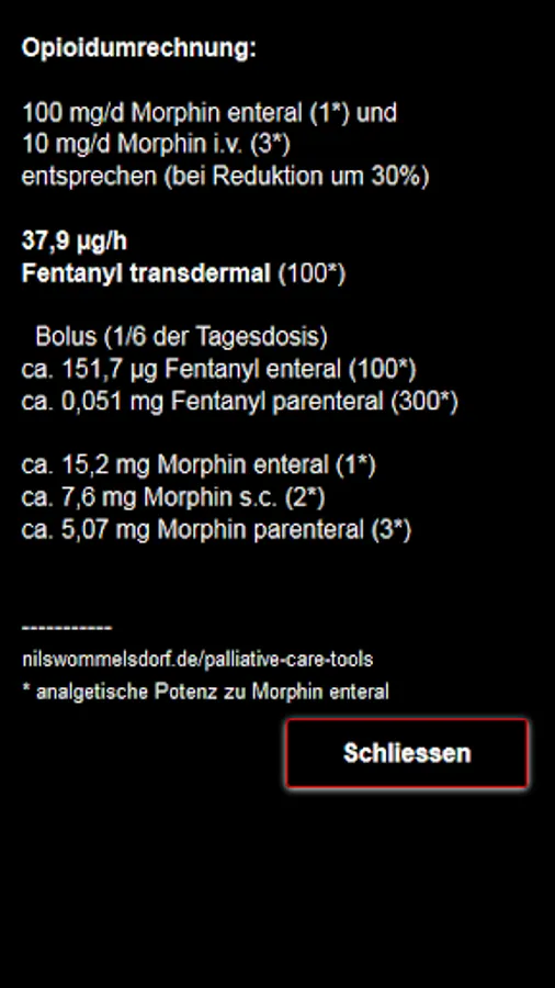 Conversion of opioids with bolus calculation (for breakthrough pain), calculation of infusions (calculation of dosage , duration rate , duration, bolus doses and with dropclicker) and conversion of corticosteroids in one tool . Portable for daily work (not only) in the palliative and oncological care for physician and nursing.