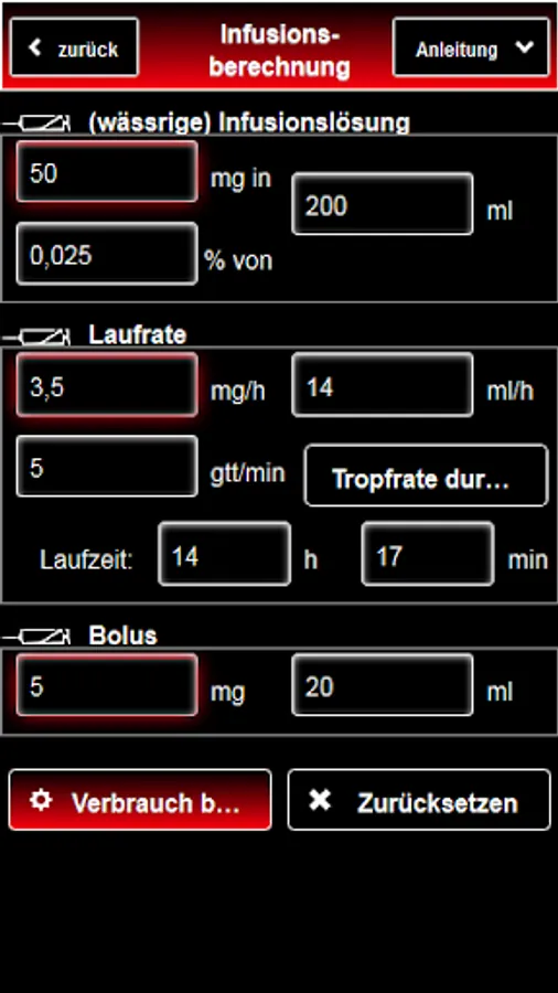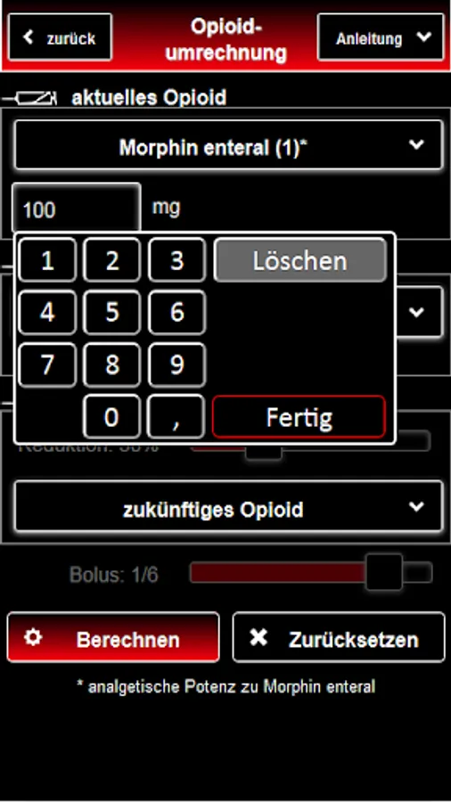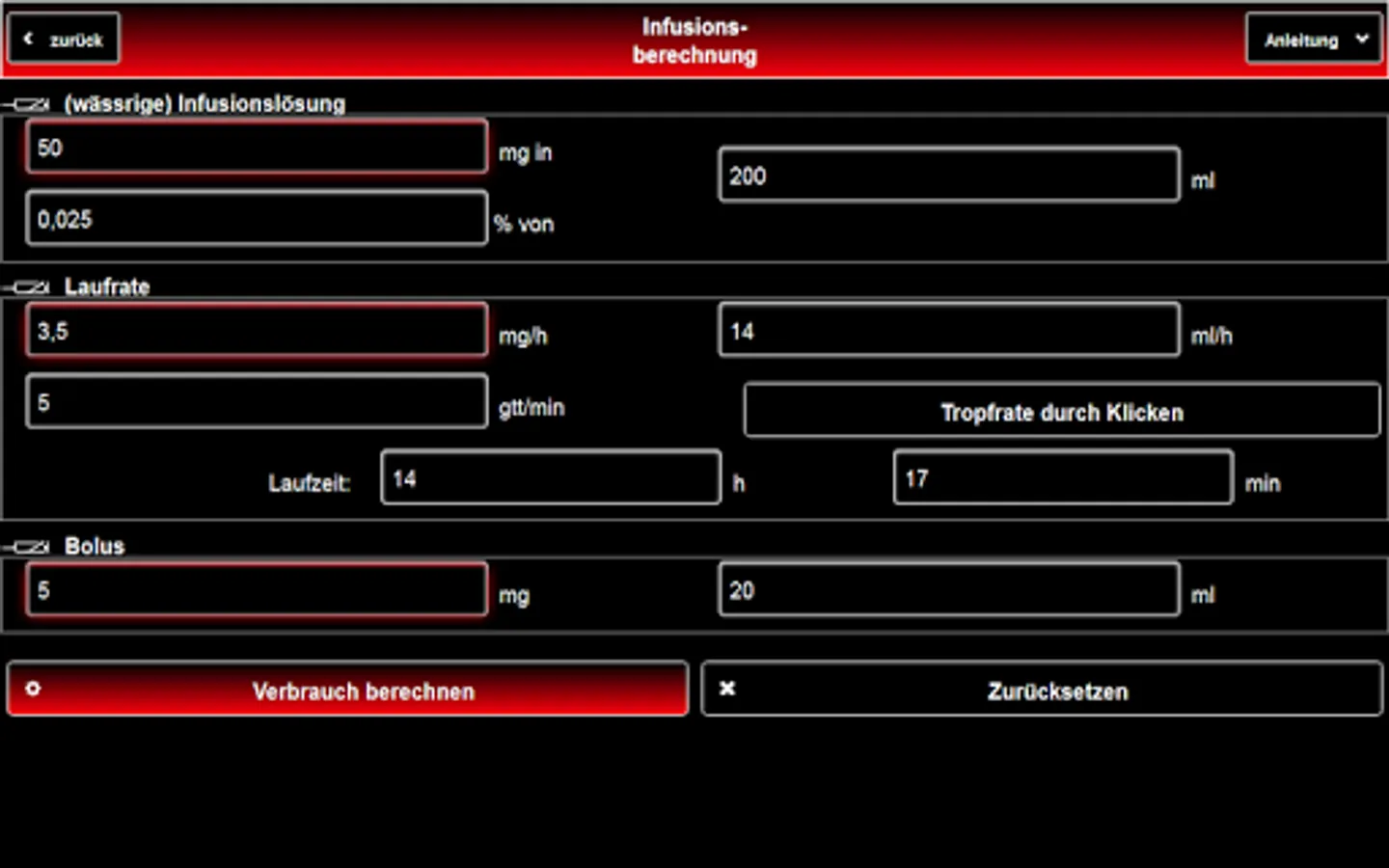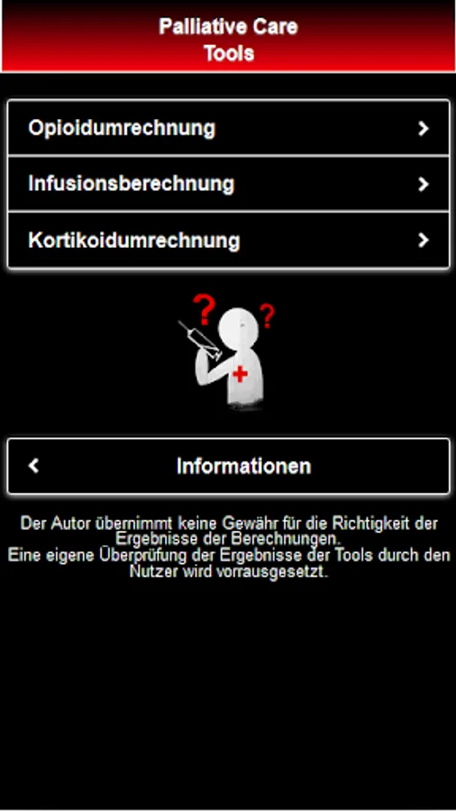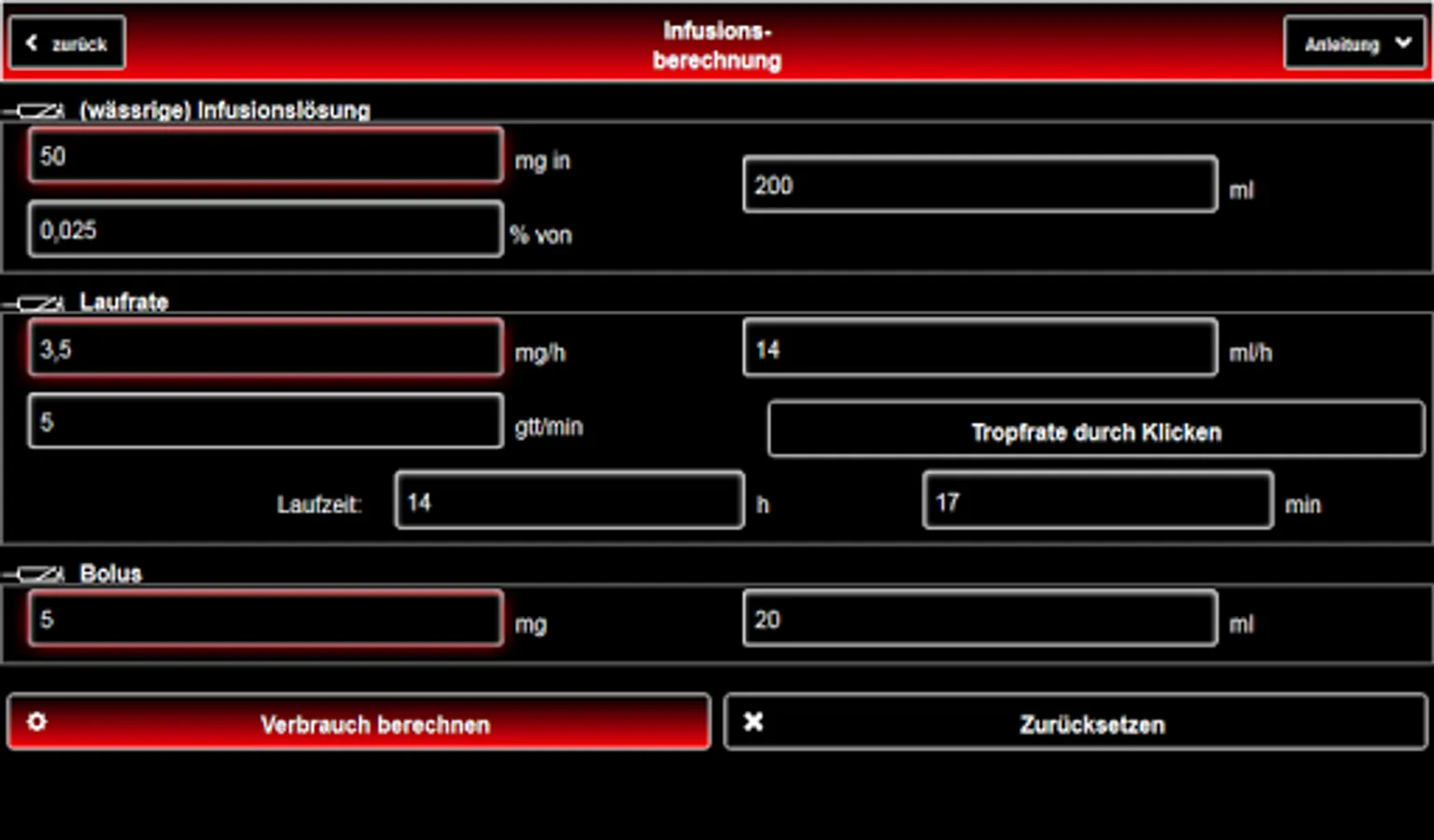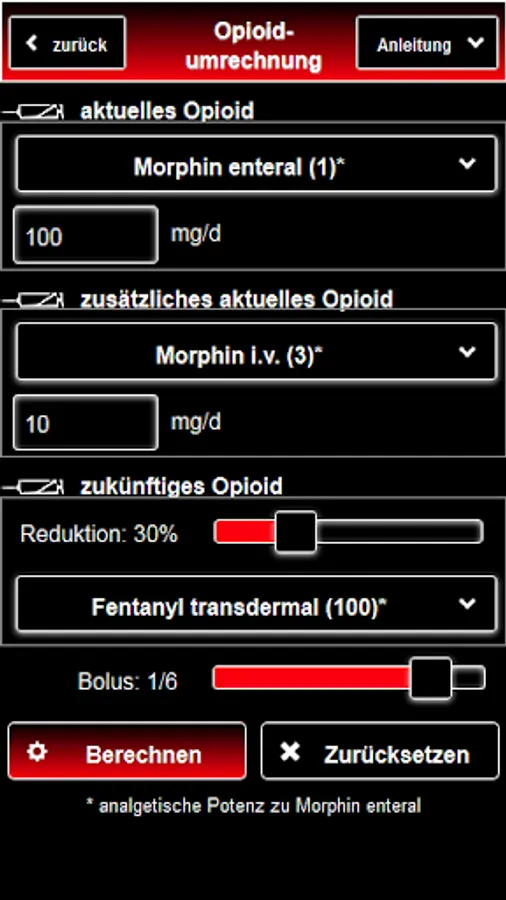 Conversion of opioids with bolus calculation (for breakthrough pain), calculation of infusions (calculation of dosage , duration rate , duration, bolus doses and with dropclicker) and conversion of corticosteroids in one tool . Portable for daily work (not only) in the palliative and oncological care for physician and nursing.