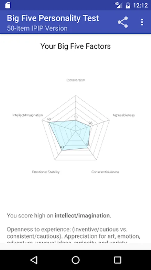 The five scales used are: extraversion, agreeableness, conscientiousness, emotional stability and intellect/imagination. These were developed to measure the Big-Five factor markers reported in the following article: Goldberg, L. R. (1992). The development of markers for the Big-Five factor structure. Psychological Assessment, 4, 26-42.