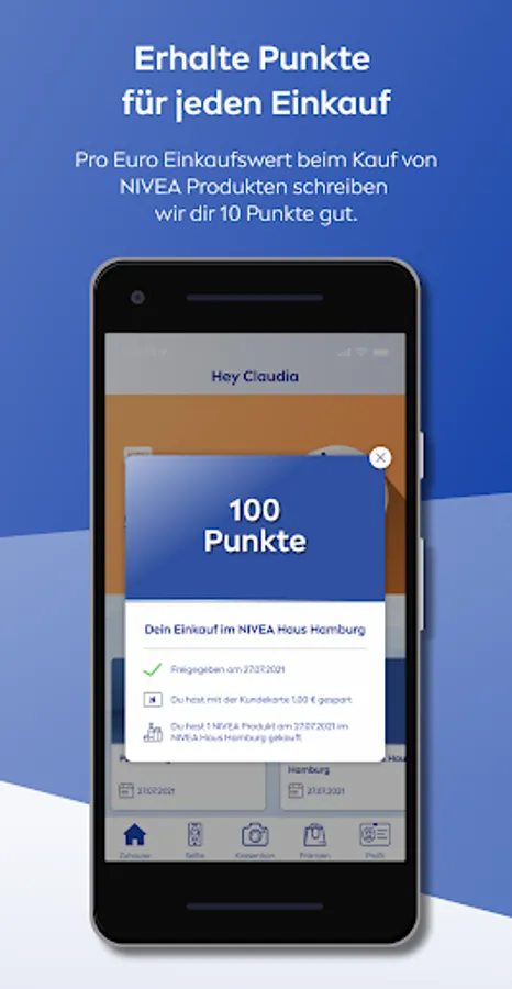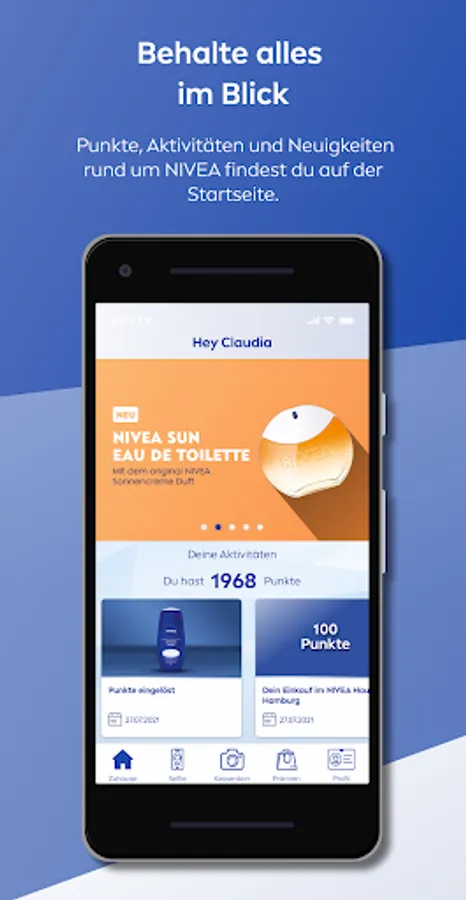 Regardless of whether you prefer to buy your NIVEA care in stores, on NIVEA.de, on amazon.de or in the NIVEA store: you can also collect points with the new NIVEA app and receive attractive rewards. Thanks to the integrated camera function, you can upload receipts easily and conveniently in the app. A look at the start page of the app shows you your activities and informs you about current promotions and new bonuses.