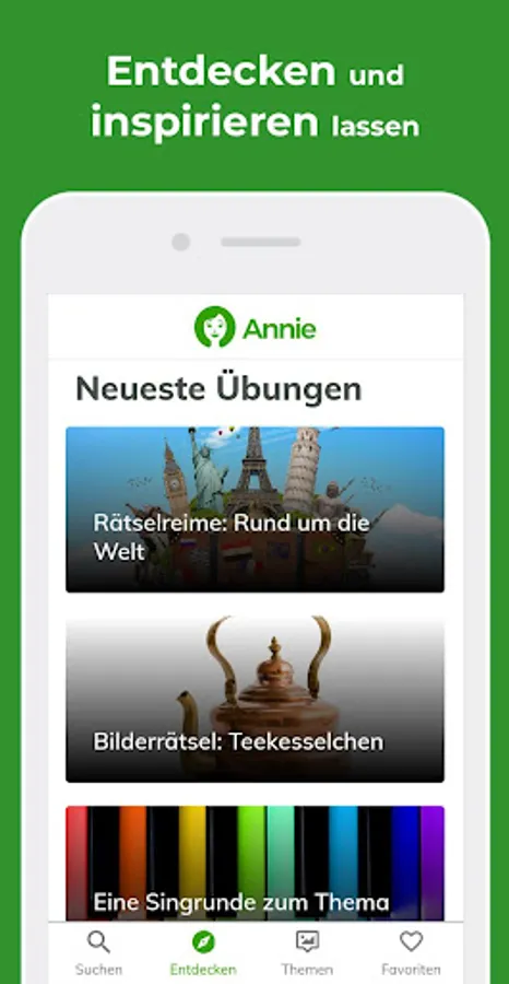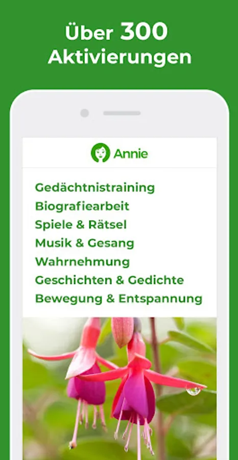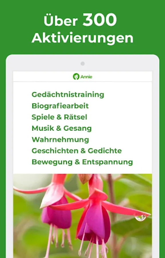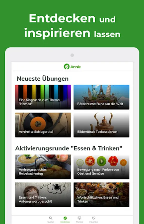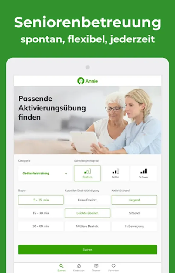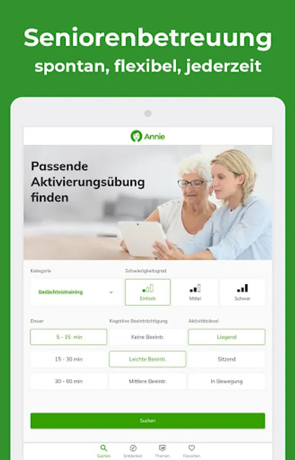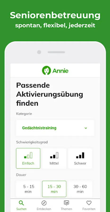 Everything you need in one app & ndash; available at any time and tailored quickly to the respective situation. Simply determine the category, level of difficulty, desired duration, cognitive impairment, and activity level. And thanks to Annie you have a clear selection of perfectly fitting ideas at your fingertips.