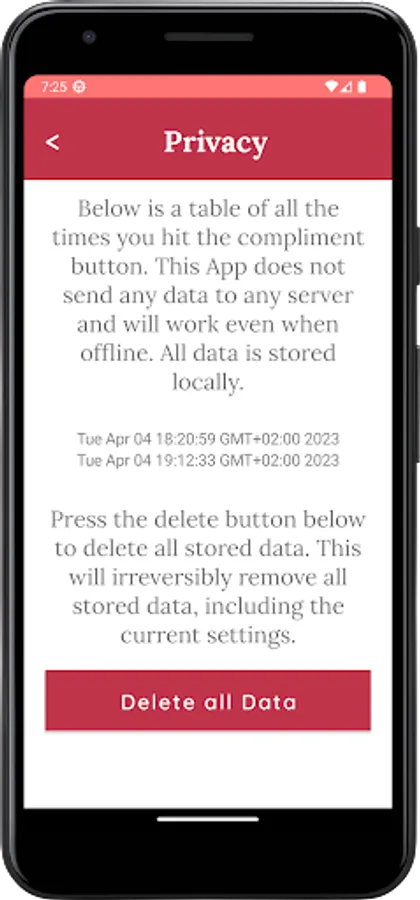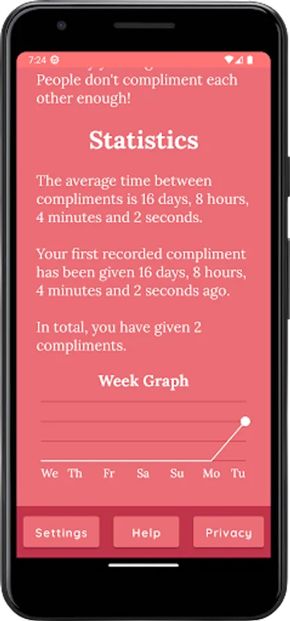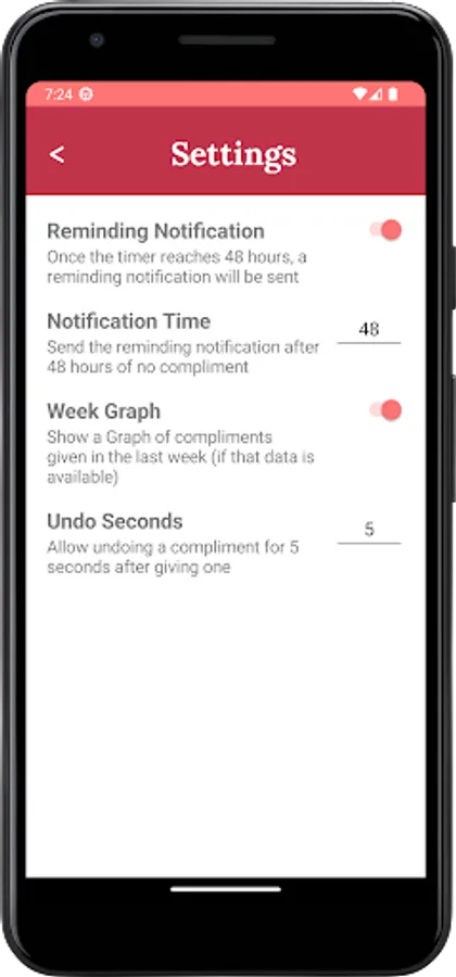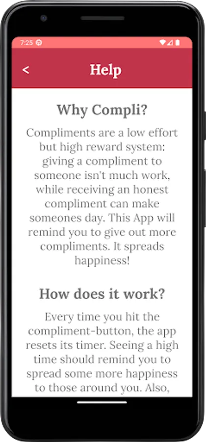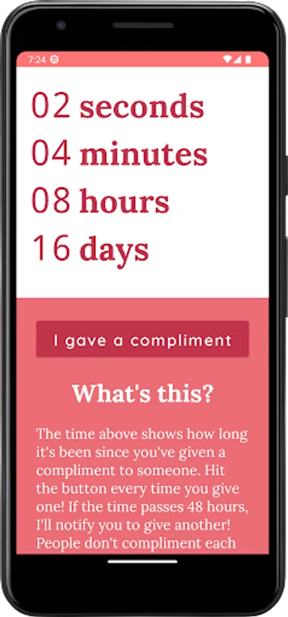 The App contains a timer telling you how long it's been since you've given someone a compliment. If you give a compliment to someone, you can reset this timer. Once this timer reaches a configurable threshold, you get a reminding notification to compliment someone. It's a really simple app that's supposed to keep people happy.