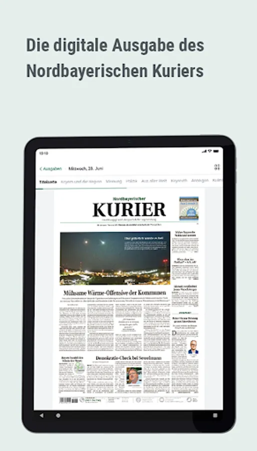 Read the most important information from the region and around the world in the digital edition of the Nordbayerischer Kurier. Get there earlier now: The latest issue is available to you every day from 8 p.m. the evening before. The Kurier E-Paper App brings the newspaper to your tablet and smartphone in a faithful representation. The optimized user interface for digital reading and many useful additional functions offer a comfortable reading experience every day.