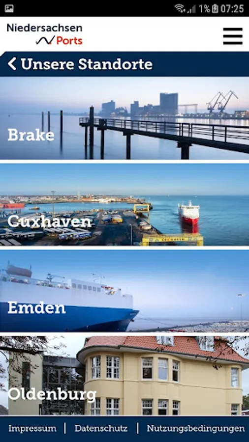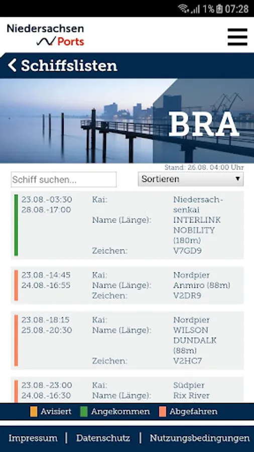 - Ship lists: current ship movements in the Lower Saxony seaports Brake, Cuxhaven, Emden, Stade and Wilhelmshaven - updated every four hours. Clear information on notified, arrived and departed ships of the respective port; practical search for ship names, callsigns etc .; easy sorting by arrival time, quay, ship name and call sign as well as detailed information on each ship (terminal, ship name, call sign, flag, type of ship, arrival, departure, quay, starting port, destination port, gross register number)