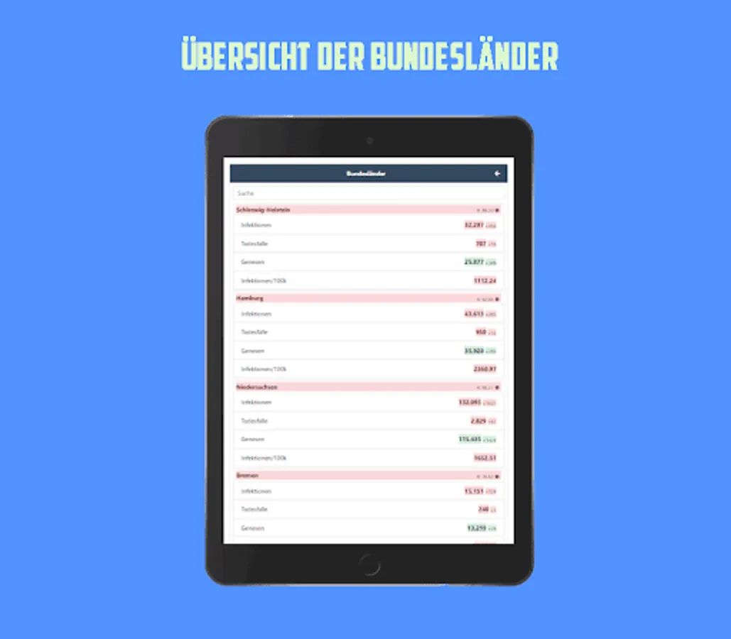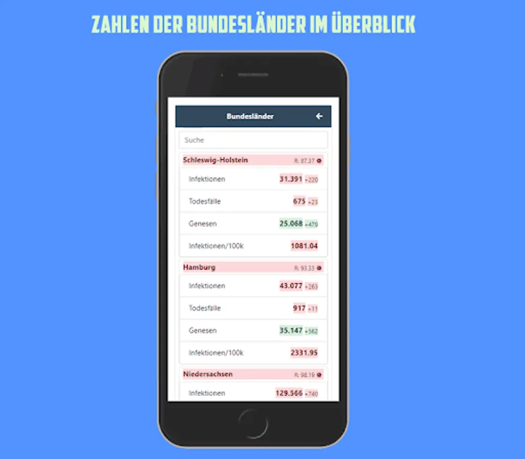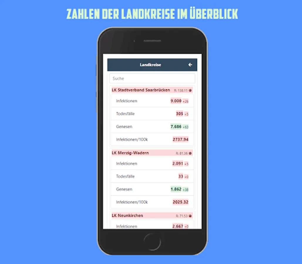 With this app you have an overview of the current number of cases in Germany, the data is updated daily from the RKI. Shown as a colored traffic light system.