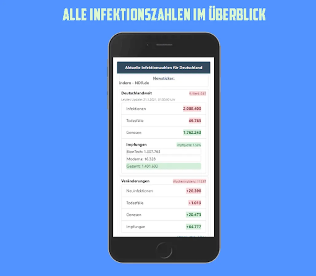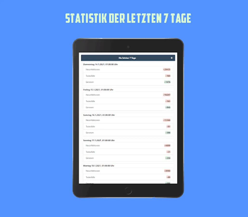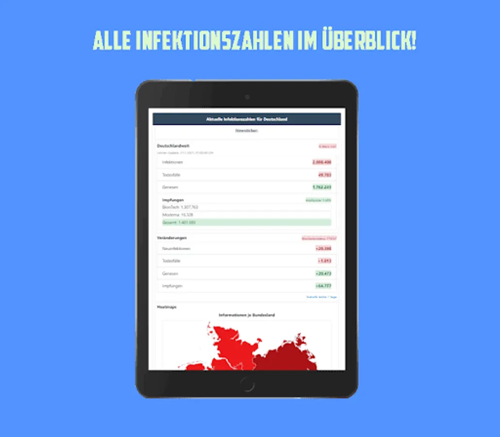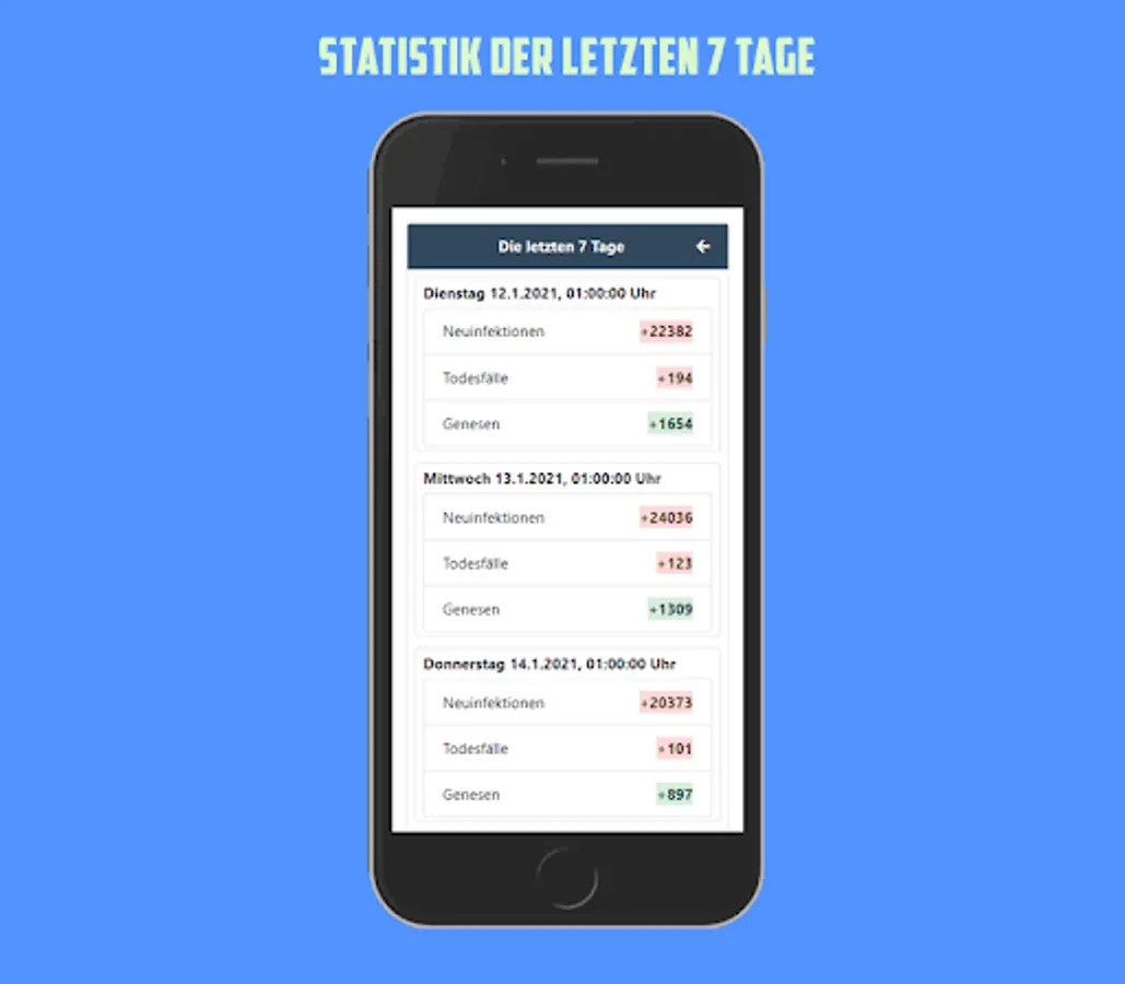 With this app you have an overview of the current number of cases in Germany, the data is updated daily from the RKI. Shown as a colored traffic light system.