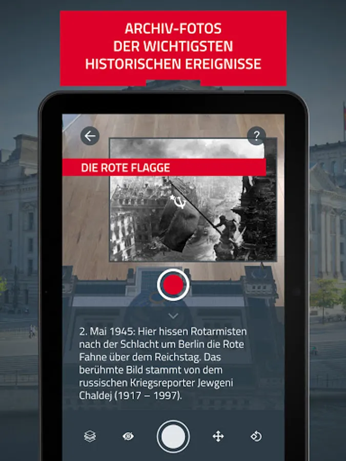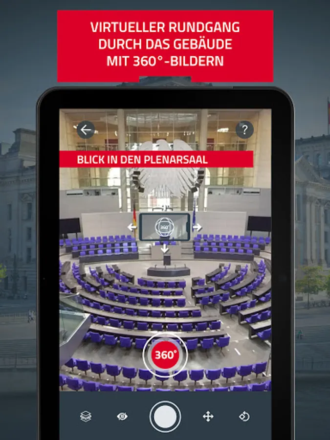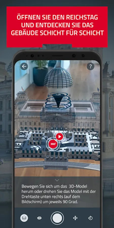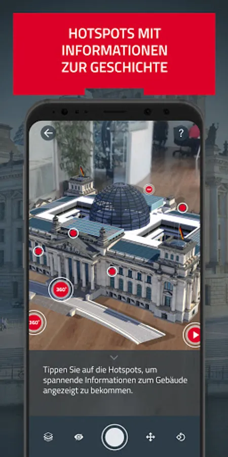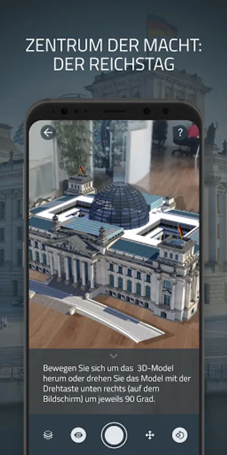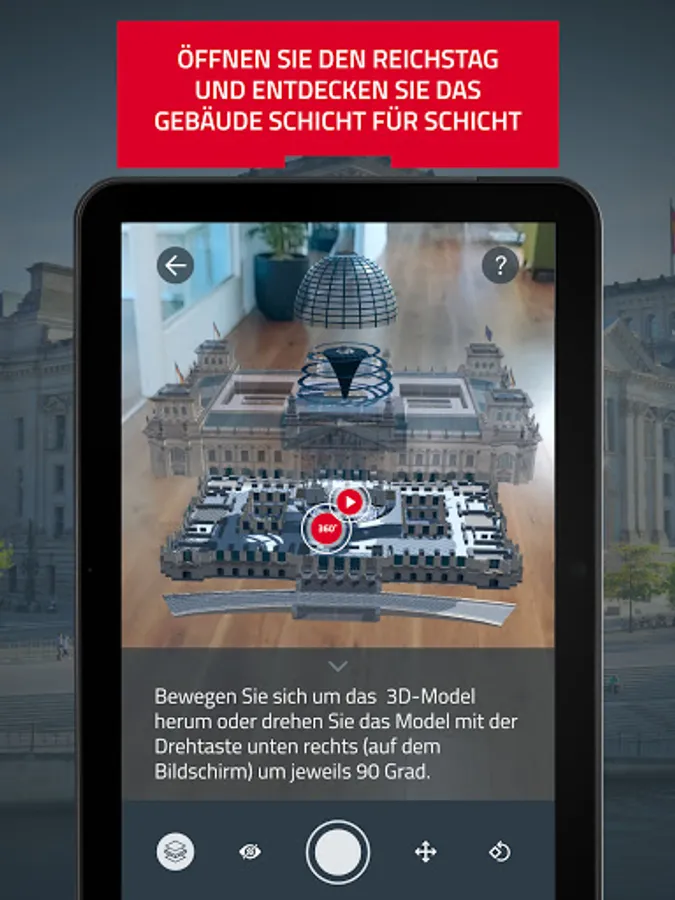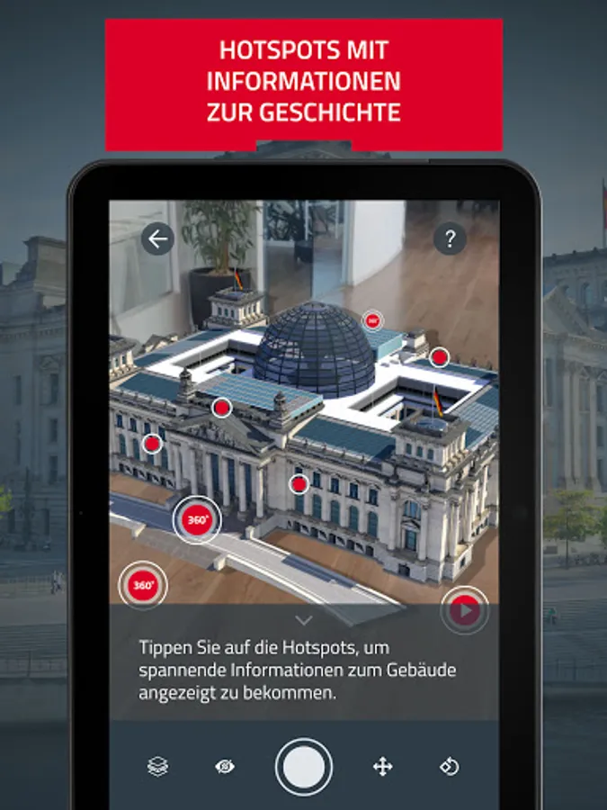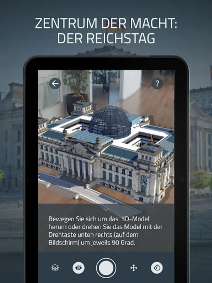 With the augmented reality application ntv "The Reichstag" you can experience the Berlin Reichstag as an interactive AR experience. A 3D model of the Reichstag can be placed on any surface within the application. Exciting video and audio elements - including archive material - are then accessed via touchpoints. Thanks to 360-degree pictures taken on site, you can virtually put yourself in the shoes of the Reichstag.