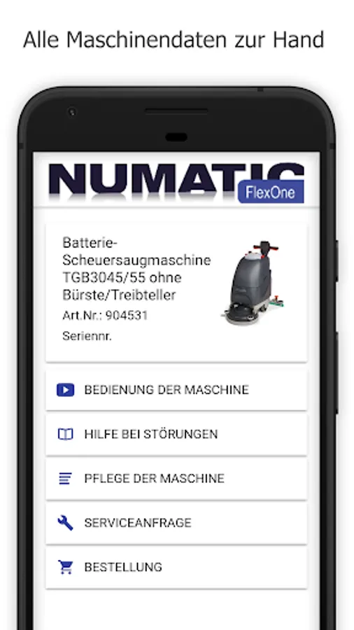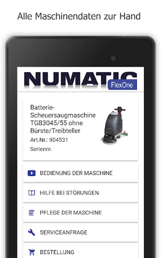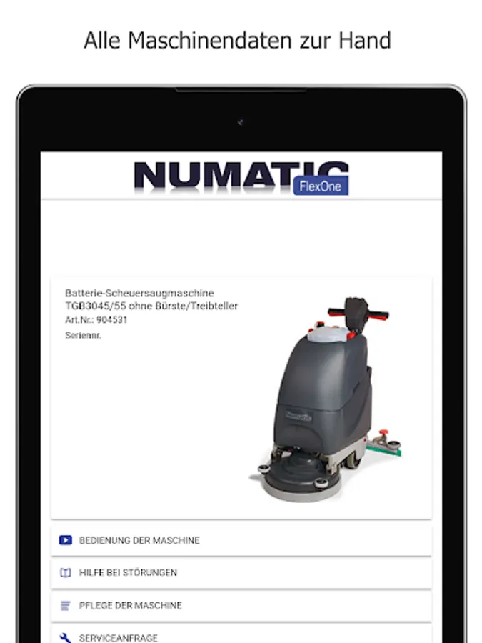 Per QR code or even quicker by NFC chip recognition all machine data are called in Numatic FlexOne