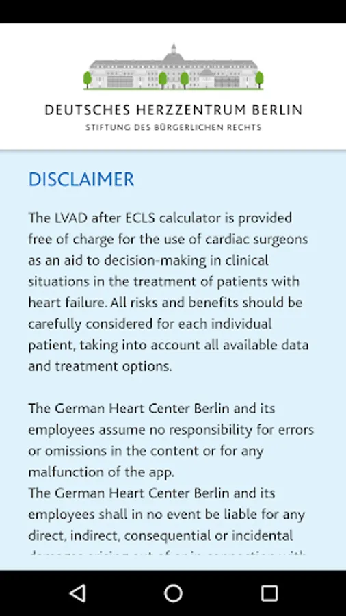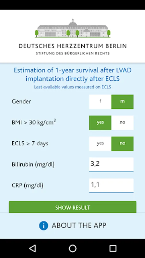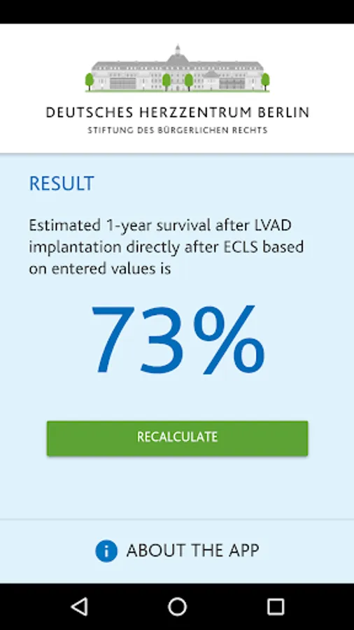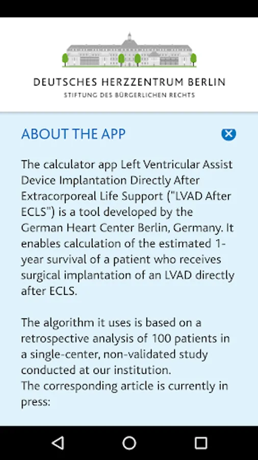 The calculator app Left Ventricular Assist Device Implantation Directly After Extracorporeal Life Support ("LVAD After ECLS") is a tool that enables calculation of the estimated 1-year survival of a patient who receives surgical implantation of an LVAD directly after ECLS.