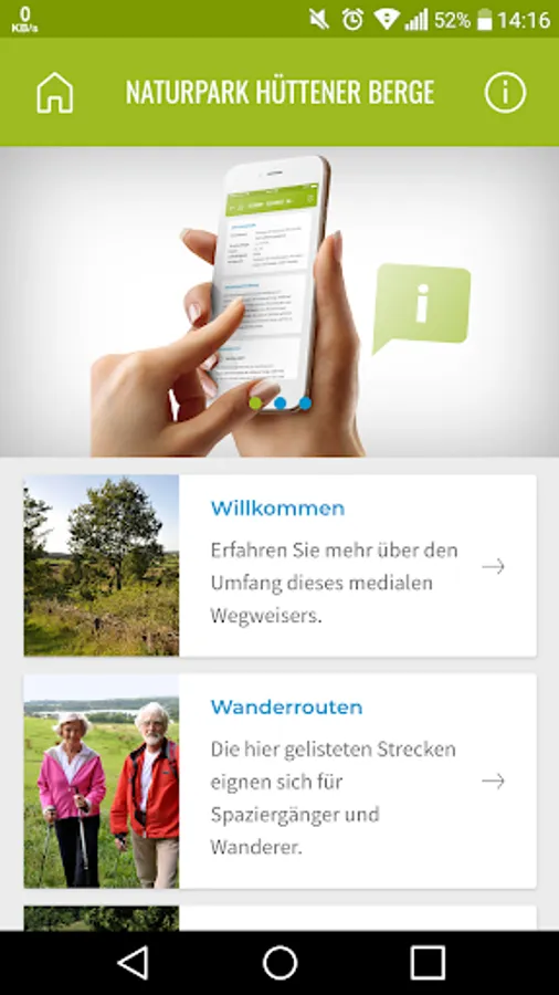 Welcome to the Natural Park Hüttener mountains! They keep our mobile guide for hikers, cyclists and skaters in the hands, which leads you to all the attractions in the region.