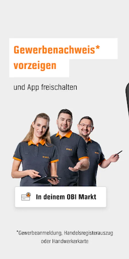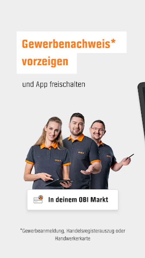 *Download and registration in the heyOBI Profi App are mandatory. To activate the company account, the trade license of a craft business must be presented to the service center in the participating OBI store. More information as well as contract terms and participating markets at www.obi.de/heyobi-profi