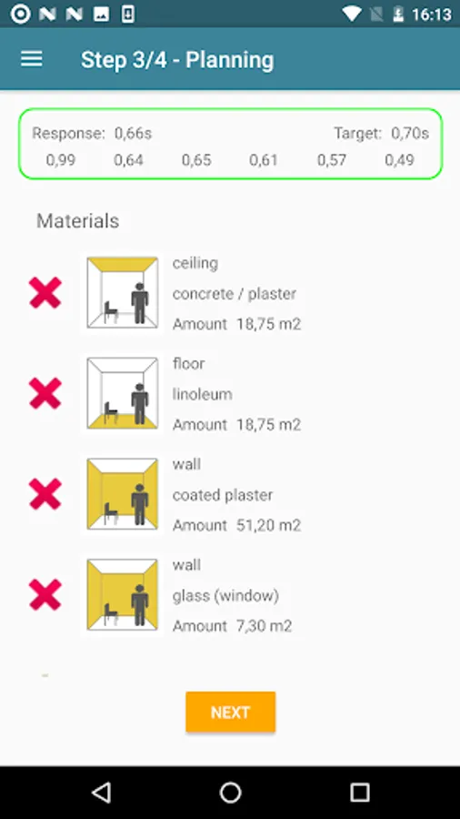 Calculation and evaluation of the reverberation time for rooms in 4 simple steps with the option to print the conclusion as a .pdf document.