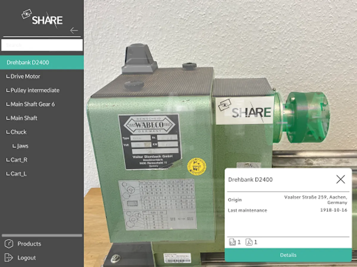 The oculavis SHARE AR Viewer is the new way to provide powerful interactive experiences on your machines to service technicians and customers alike. With just a few clicks, the user can go from the CAD model of a machine to an interactive Augmented Reality visualization. By overlaying an AR model over the real machine, the user is able to quickly get a first look into the machine without disturbing the ongoing machine operation. Once the user has opened up the machine, it becomes fascinatingly easy and intuitive to retrieve documents, cases and workflows belonging to specific components of the machine.
