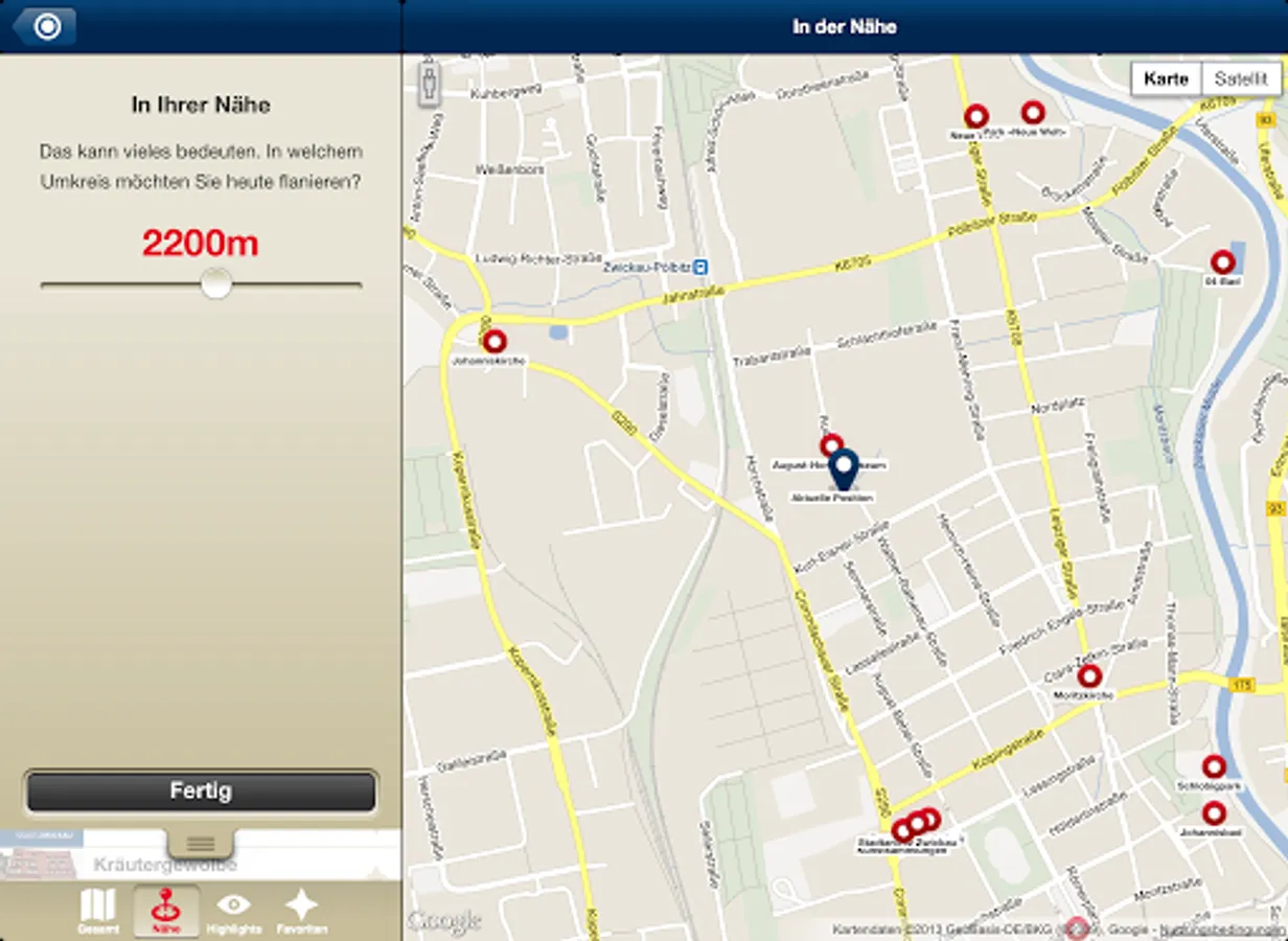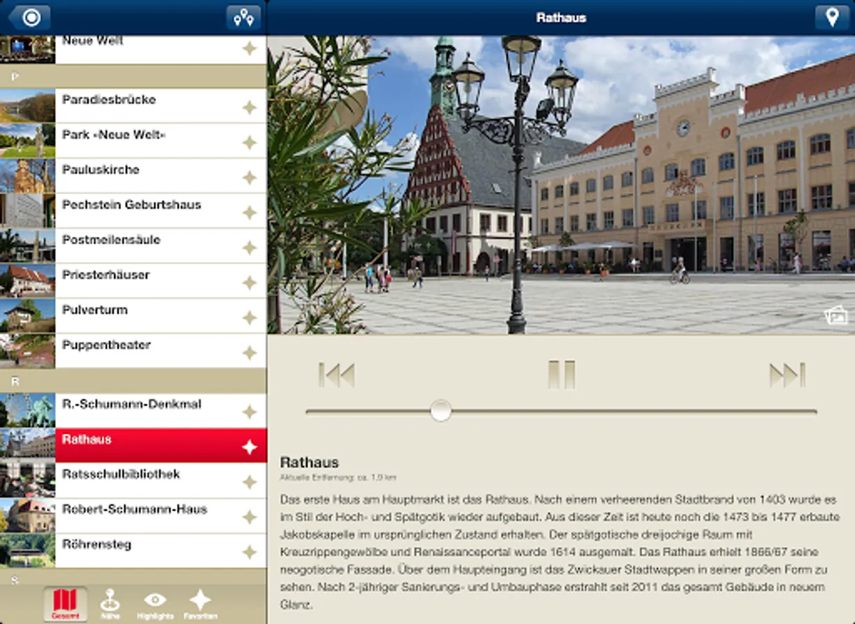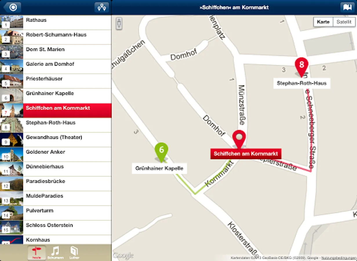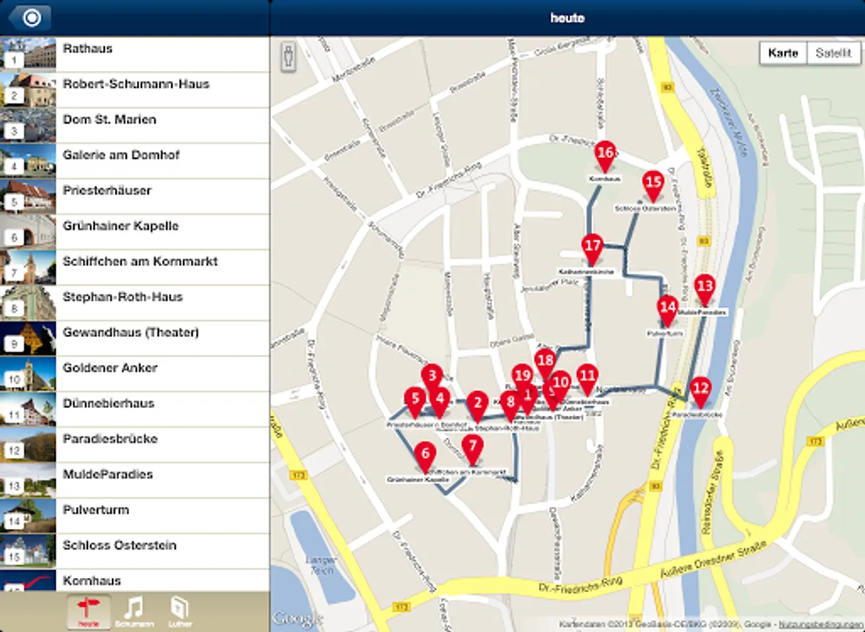 Our tourism app guides you in German and English to more than 50 attractions and points of interest within the city limits. Discover the August Horch Museum one of the finest automobile museums in Germany. Listen to the birthplace of Robert Schumann the sounds of his world-famous works. Or equip from one of the oldest preserved residential building ensembles in Germany, the priest houses, a visit. Either you imagine your favorites individually or together to embark on one of three guided tours. You can today Zwickau Meet and walk on historic trails to Luther's and Schumann's times. The integrated Audiogiude, a variety of images and text, as well as the interactive map will accompany you on your journey through the city.