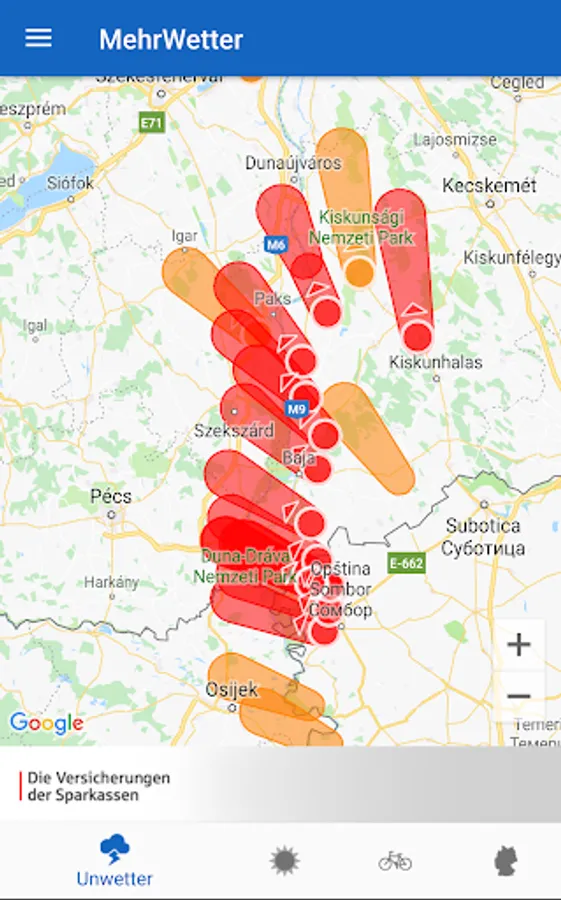 The severe weather warnings and weather advisories come from the UBIMET Group's severe weather center. Warnings are issued by the meteorologists at the severe weather center in the event of acute storms/hurricanes, heavy rain, heavy snowfall, thunderstorms (with heavy rain, hail and squalls), black ice rain, 1st ground frost, air frost from -10 degrees and heat from 30 degrees. All severe weather warnings are accurate to the zip code and the weather information is displayed over a large area.