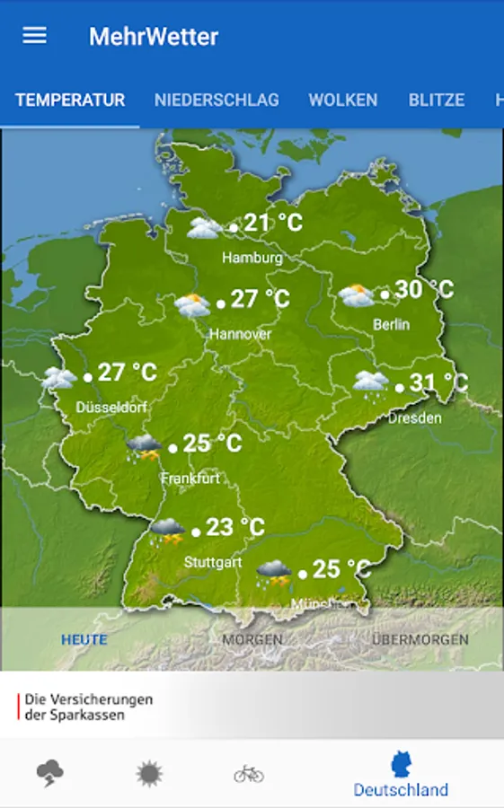 • Detailed map views for Germany with current weather films (precipitation, clouds, lightning)