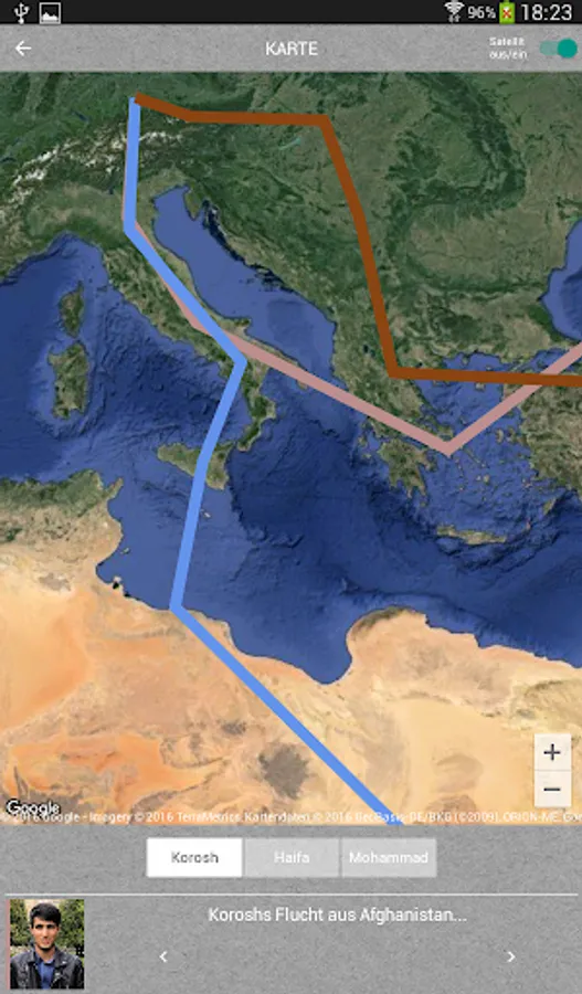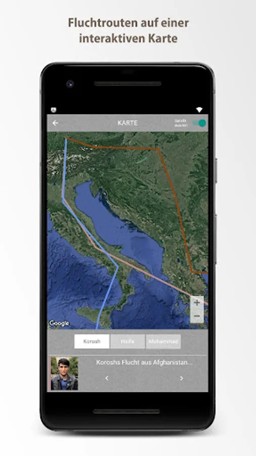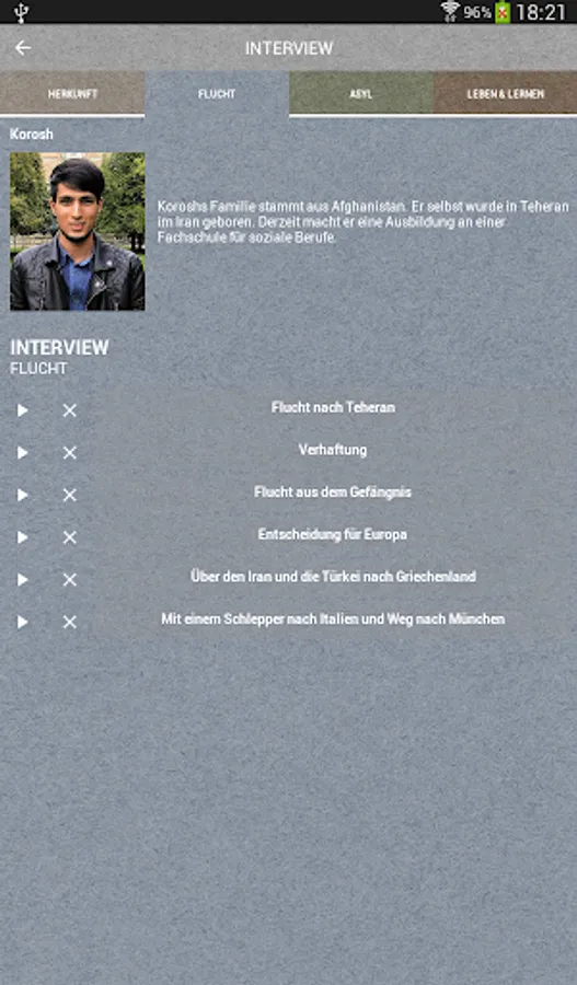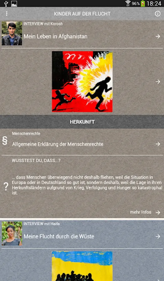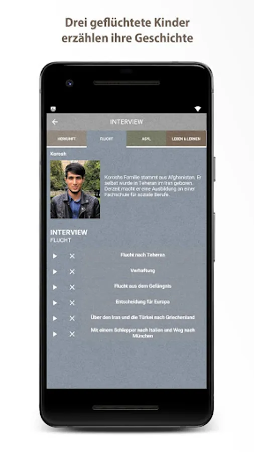 In this app the three refugee children Korosh, Haifa and Mohammad tell the story of their escape to Germany. The interviews are stored as audio and text are divided into the areas of origin, flight, asylum and living and learning in Germany.