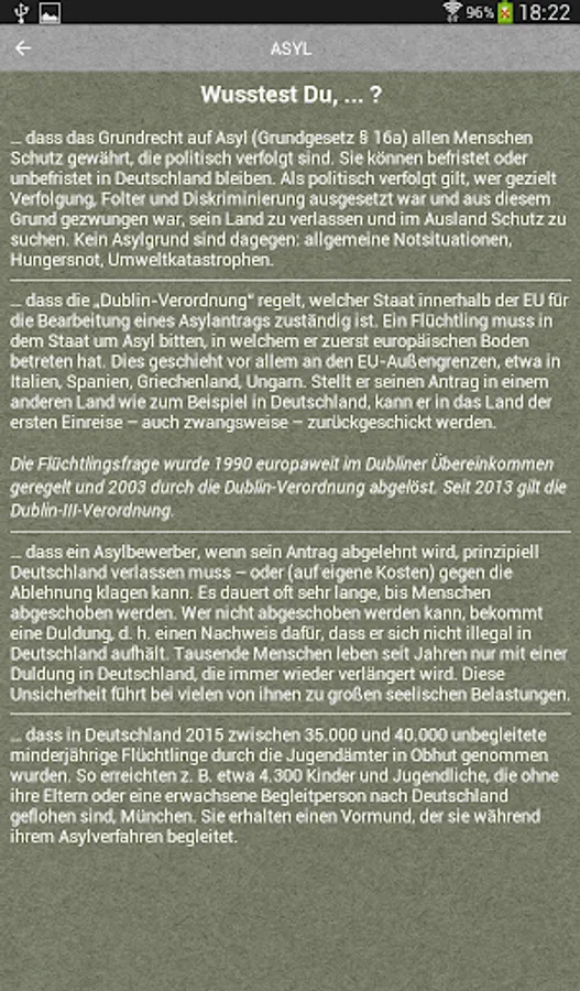 To Find out more about human rights and fundamental rights, the Geneva Convention and the Child Rights Convention, the asylum procedure and the living conditions of young refugees in Germany can be experienced. The app also provides information on the first places to which committed citizens can turn when they want to help.
