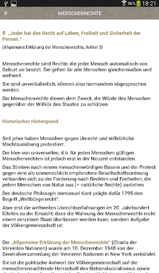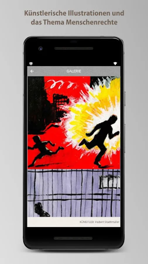 Along this thematic structure, the App-depth information: Handy Facts such "Did you know that ..." inform and to educate about prejudices. More detailed texts on the subject of human rights provide appropriate background information. About an interactive map the various escape routes can be tracked. Pictures of the artist Hubert Stadtmüller illustrate the various topics.