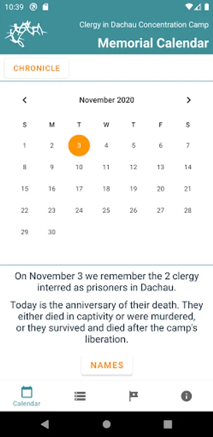 The main elements contained in the “Clergy in Dachau Concentration Camp” app are an interactive Memorial Calendar and a database with research function.