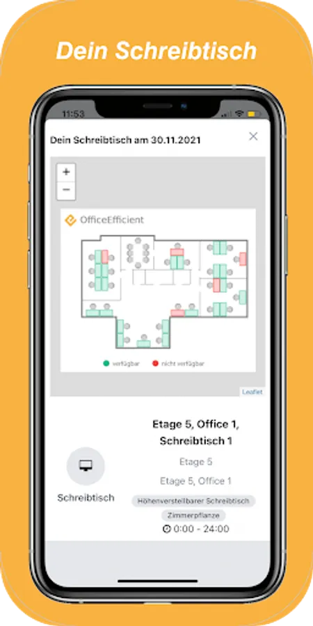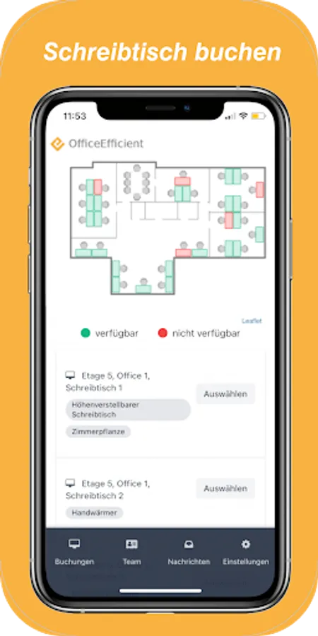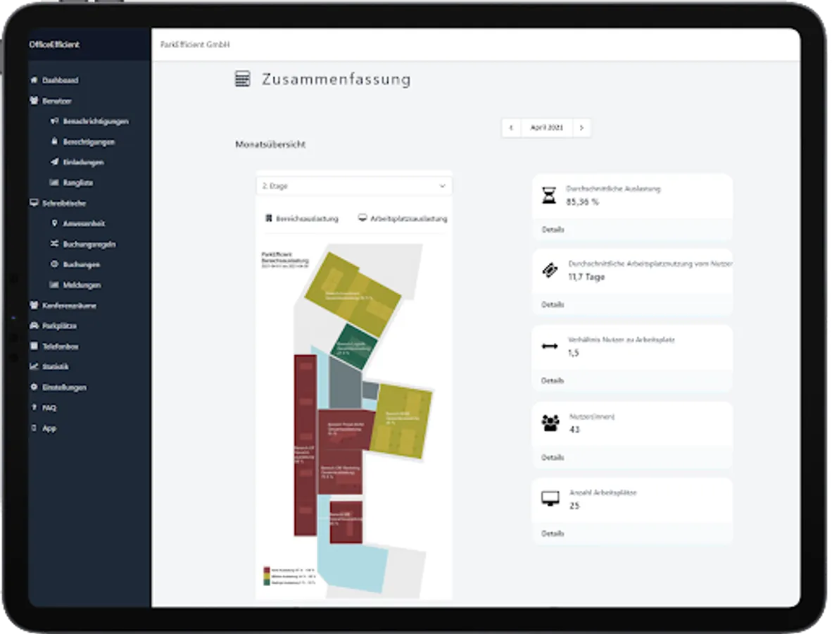 Use the OfficeEfficient app to reduce the administrative effort involved in booking workstations, conference rooms, etc. to a minimum. In the age of desk sharing and mobile working, a quick and easy management process is essential. With our application, expensive office space can be minimized and efficiently managed digitally without installing additional hardware.