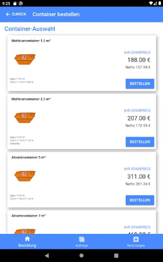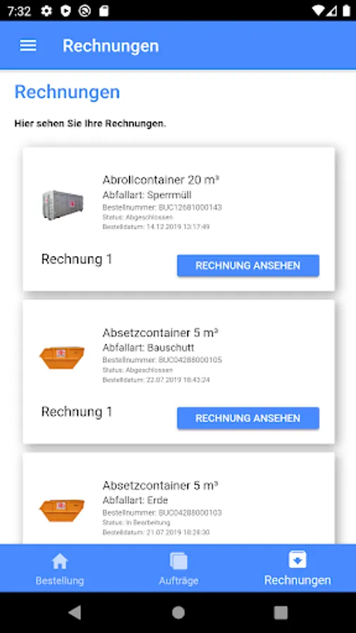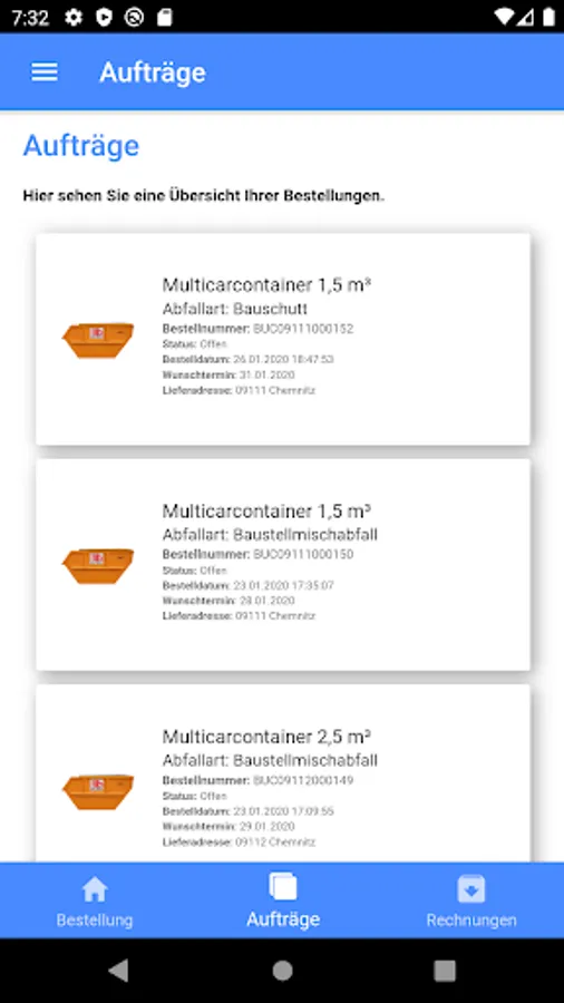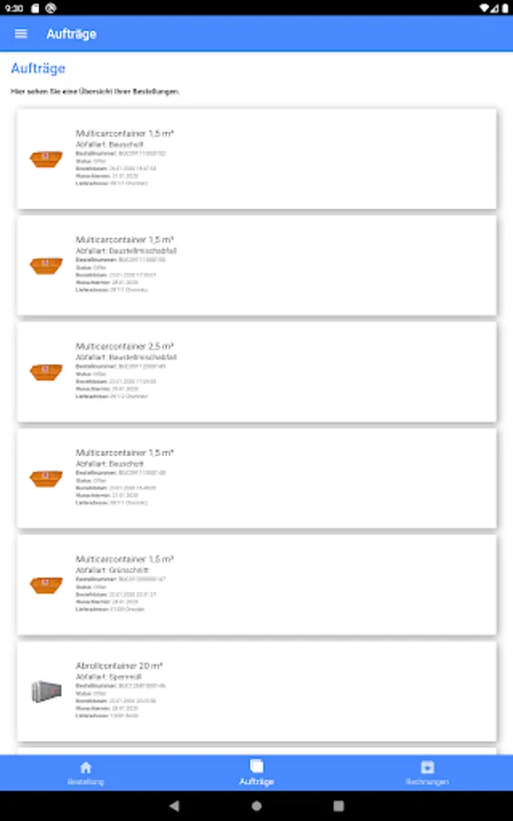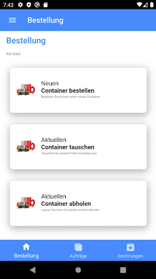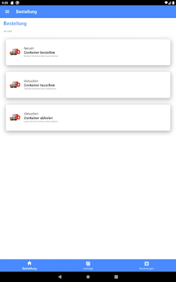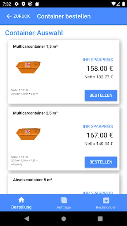 With this app you can easily book our available containers and bins (stacker, dispenser, multicar) with your type of waste. Easily select your delivery location, desired date and time from home or on the go, and pay for it via PayPal. The collection of your container can then also be ordered via the app. Regardless of whether you are a private or commercial customer, you all benefit from this efficient, time-saving and relaxed work.