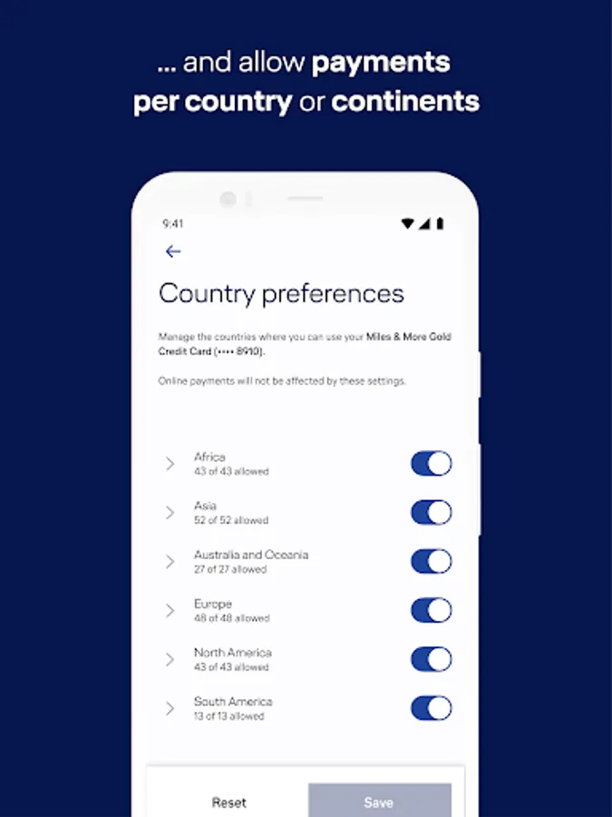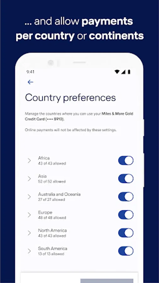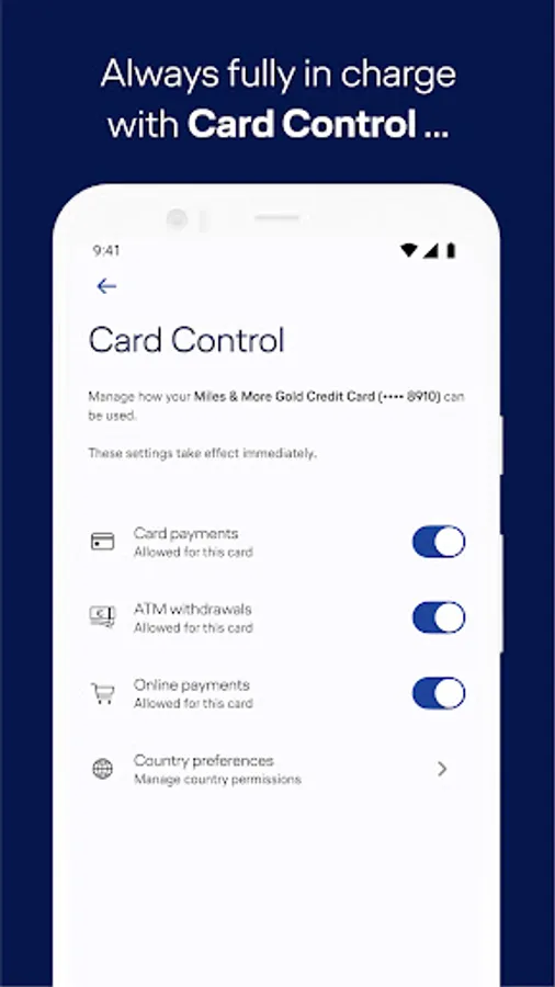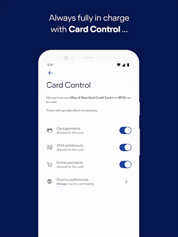 • Easy modification of your Card Control settings for improved security and transparency when paying