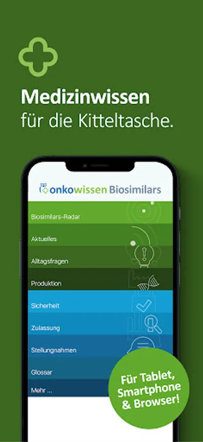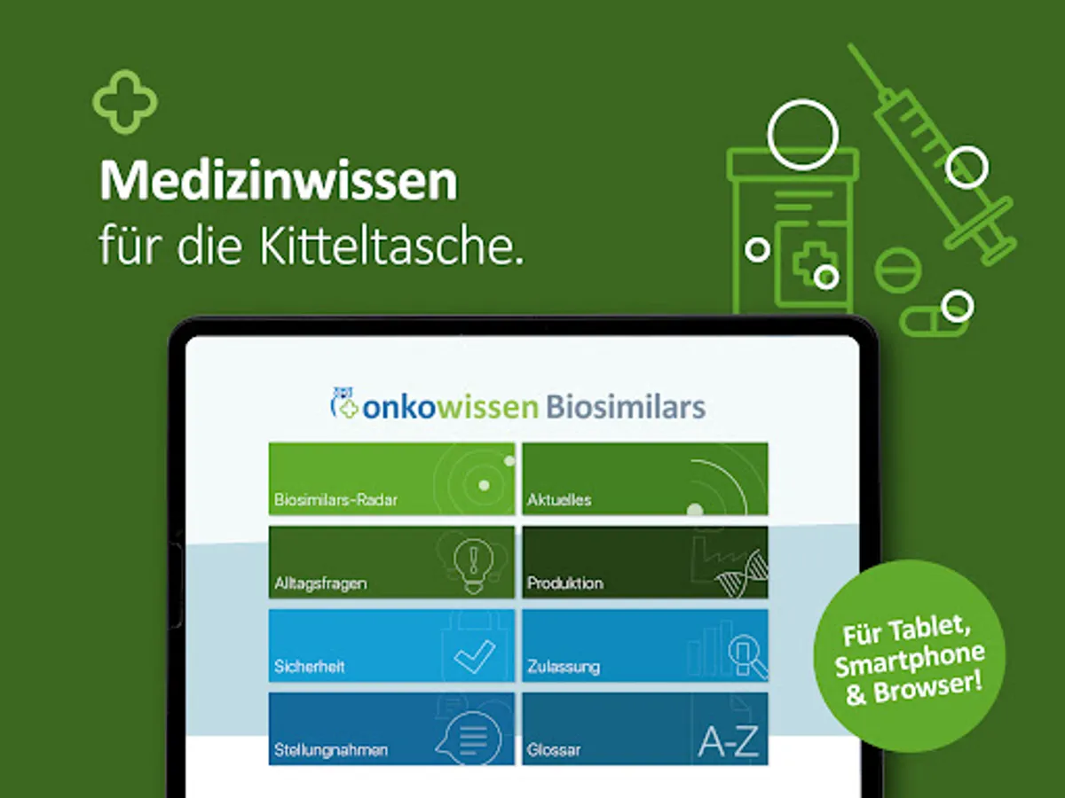 The onkowissen Biosimilars app offers you digital, fast, simple and up-to-date access to extensive information on biosimilars. The app was developed in cooperation with interdisciplinary experts to ensure a comprehensive and up-to-date overview of biosimilars. The app presents modern educational content and offers links to current official information and interesting research articles.
