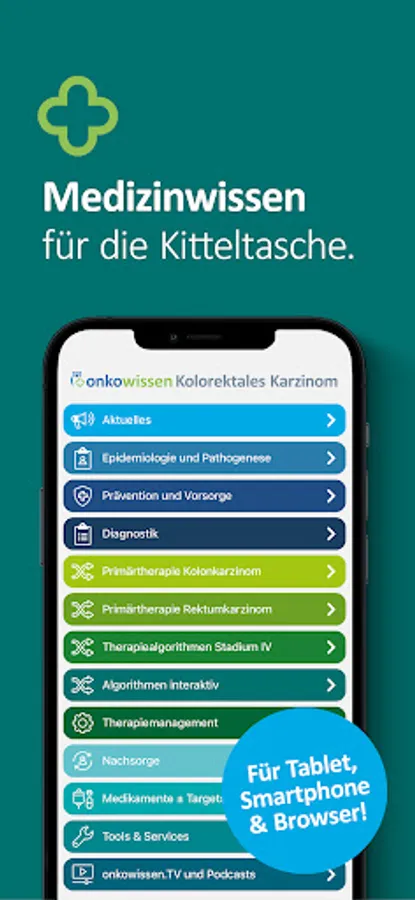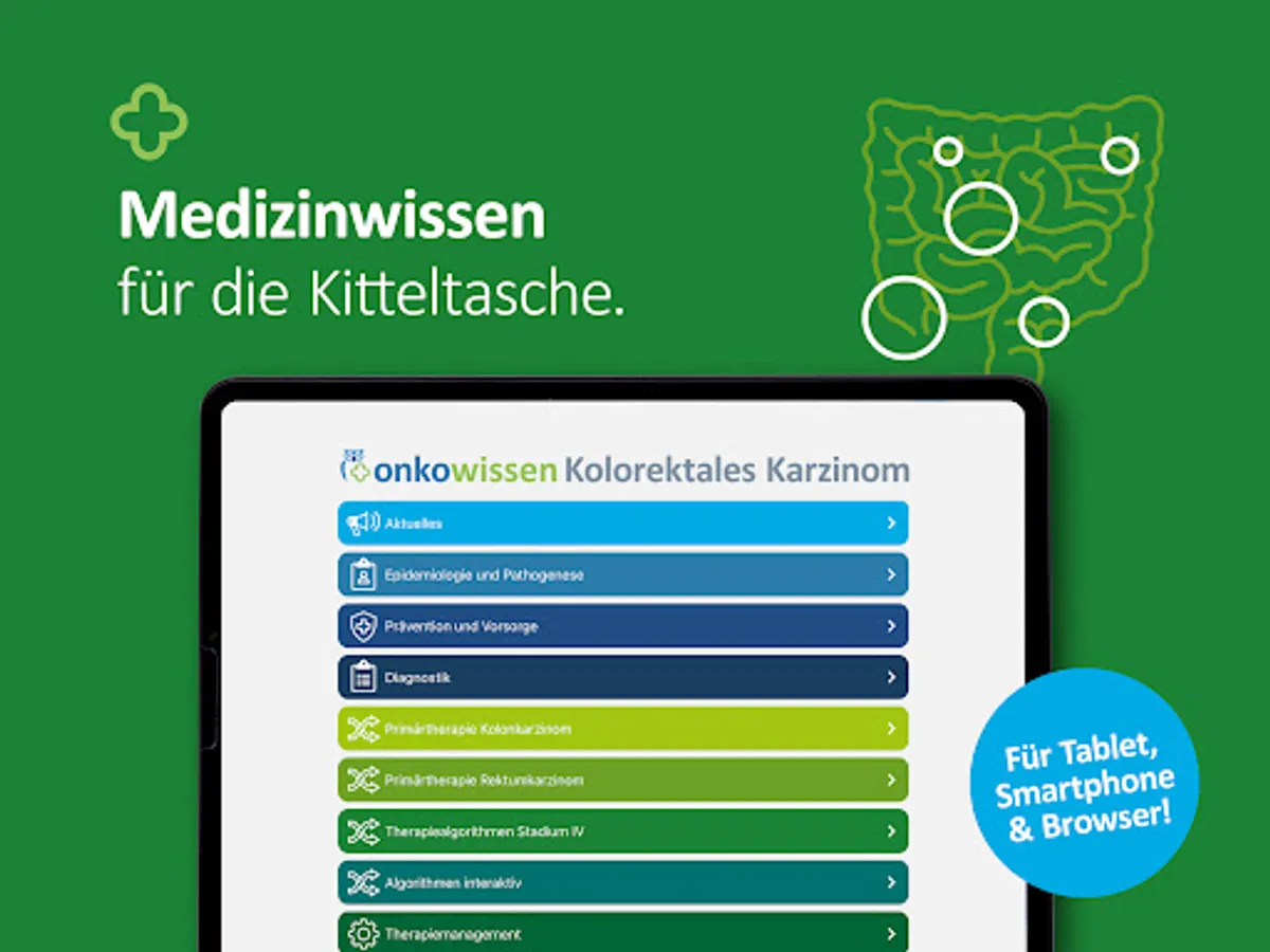 The app onkowissen Colorectal Cancer offers you digital, quick, easy and up-to-date access to extensive information about the diagnosis and treatment of colorectal cancer. The app was developed and implemented in cooperation with medical experts. This app is intended only for professionals with an onkowissen.de login.