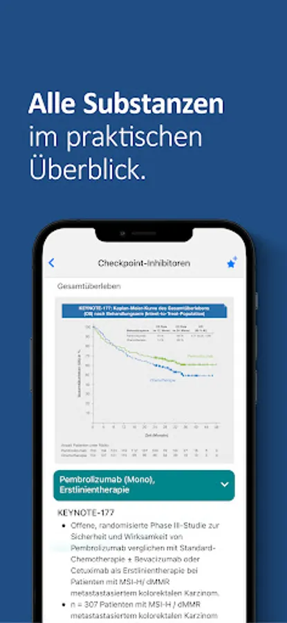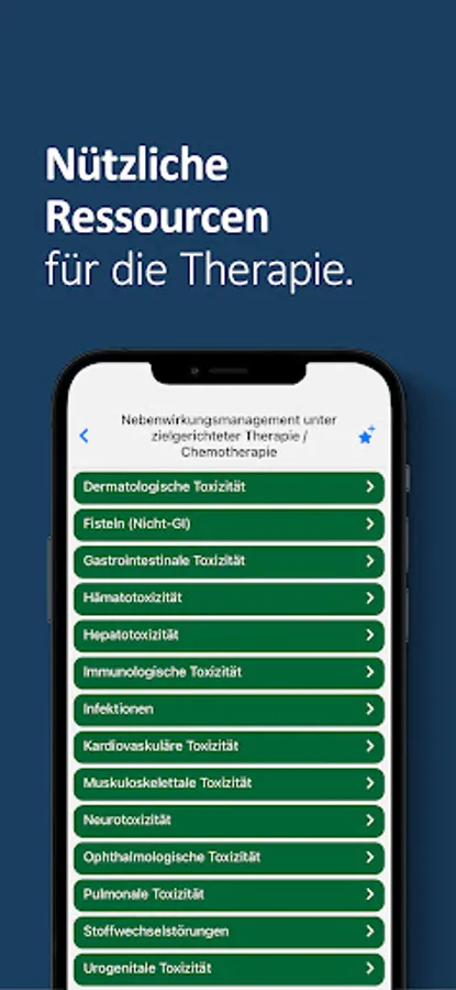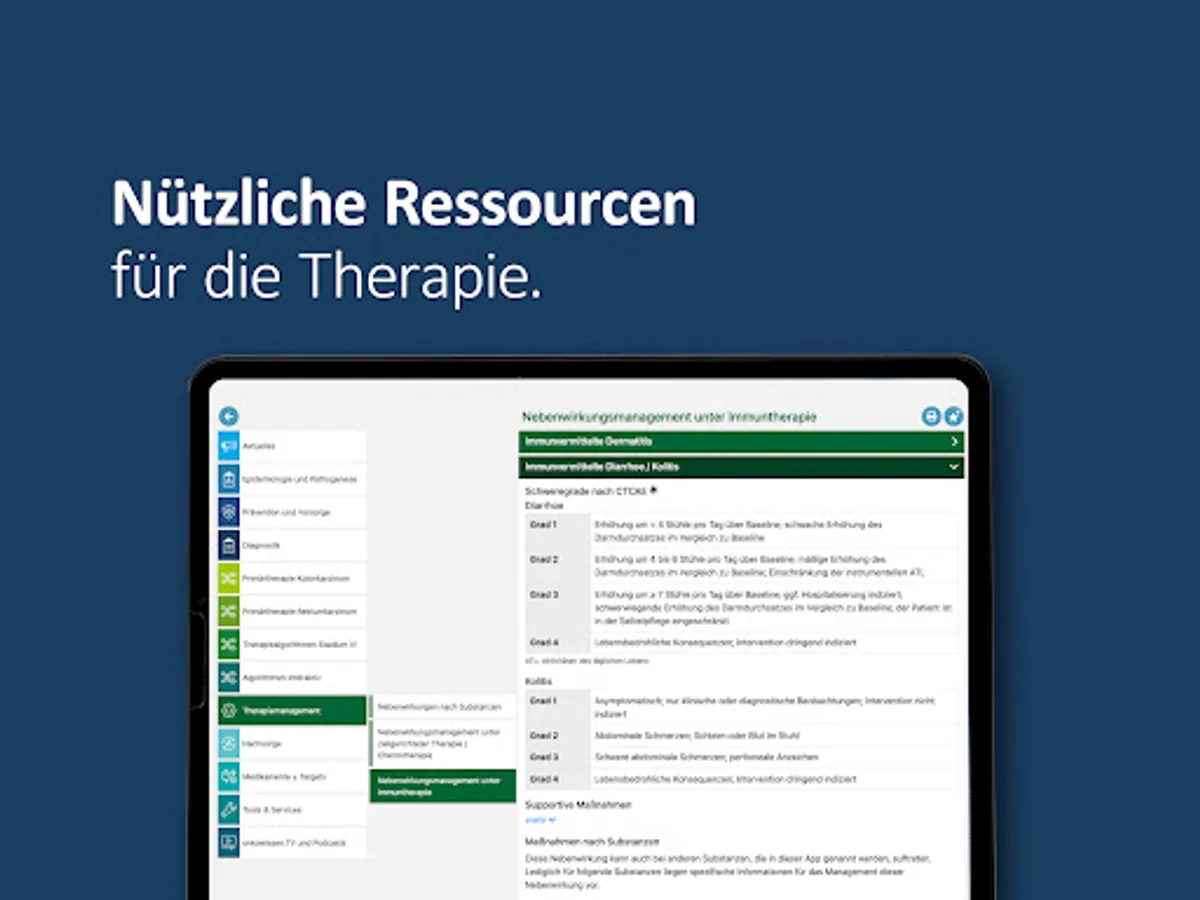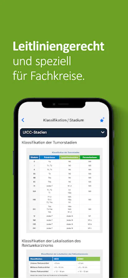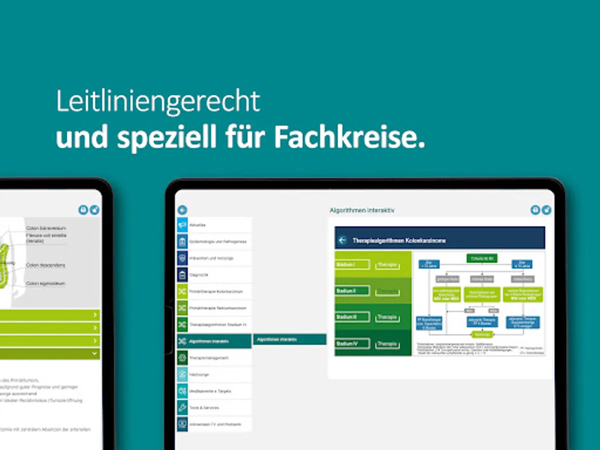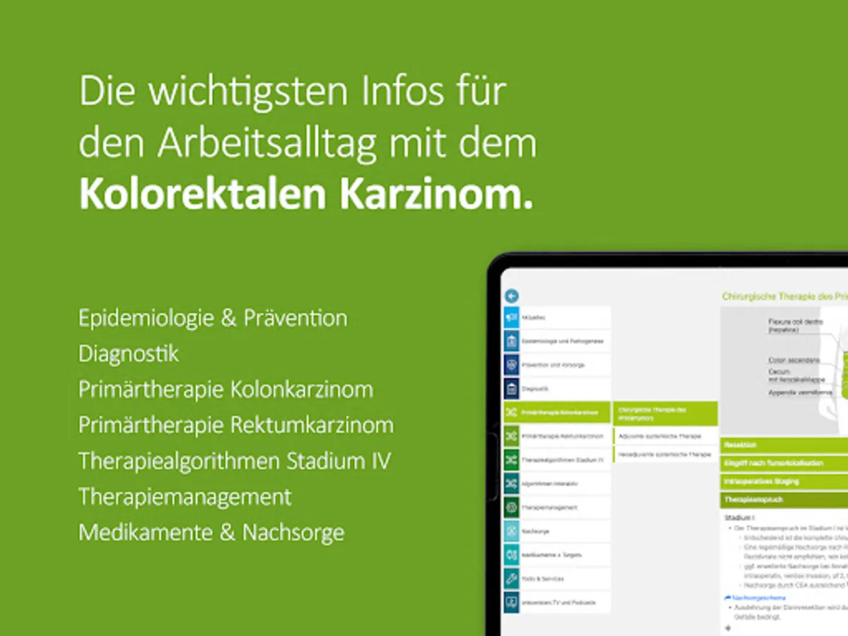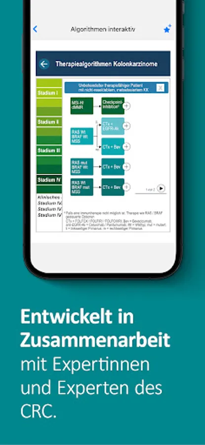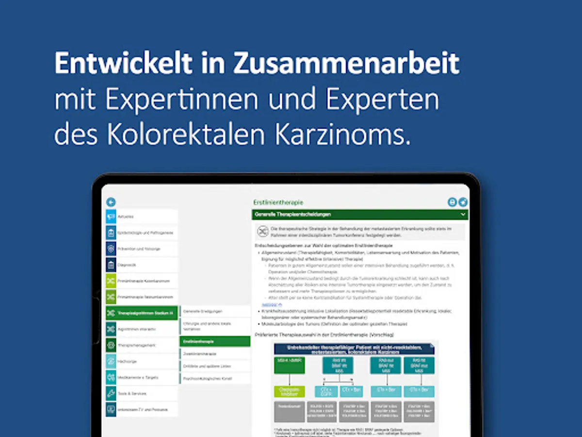 The app also contains an interactive graphic for the therapy algorithm, which includes all therapy options for stages I-IV of colon and rectal cancer. The user can navigate in the therapies according to his interests.