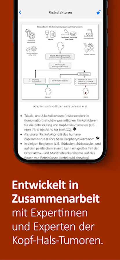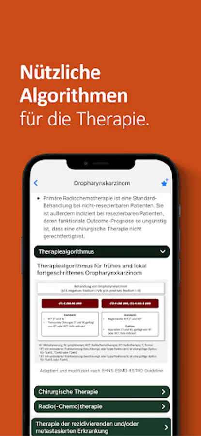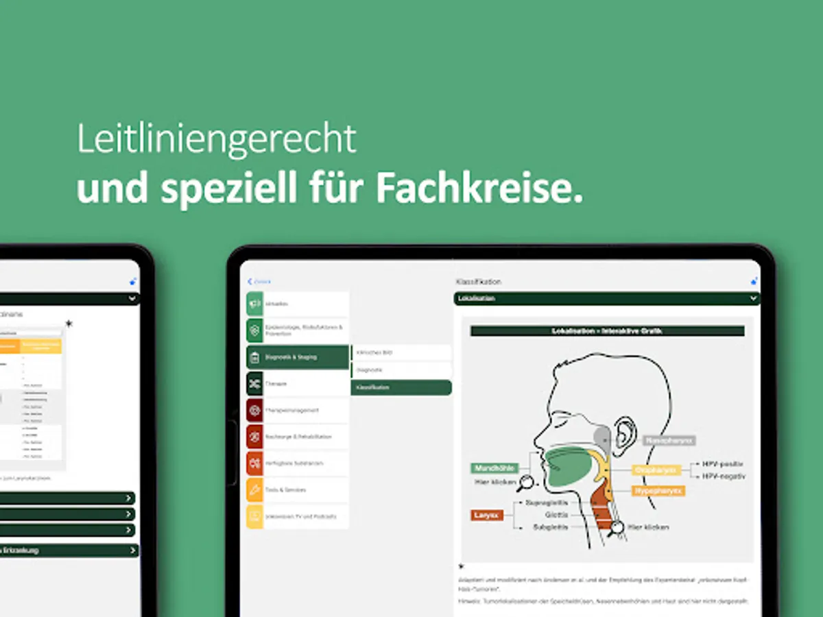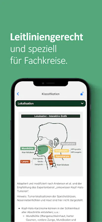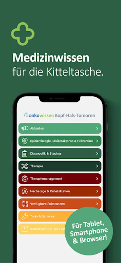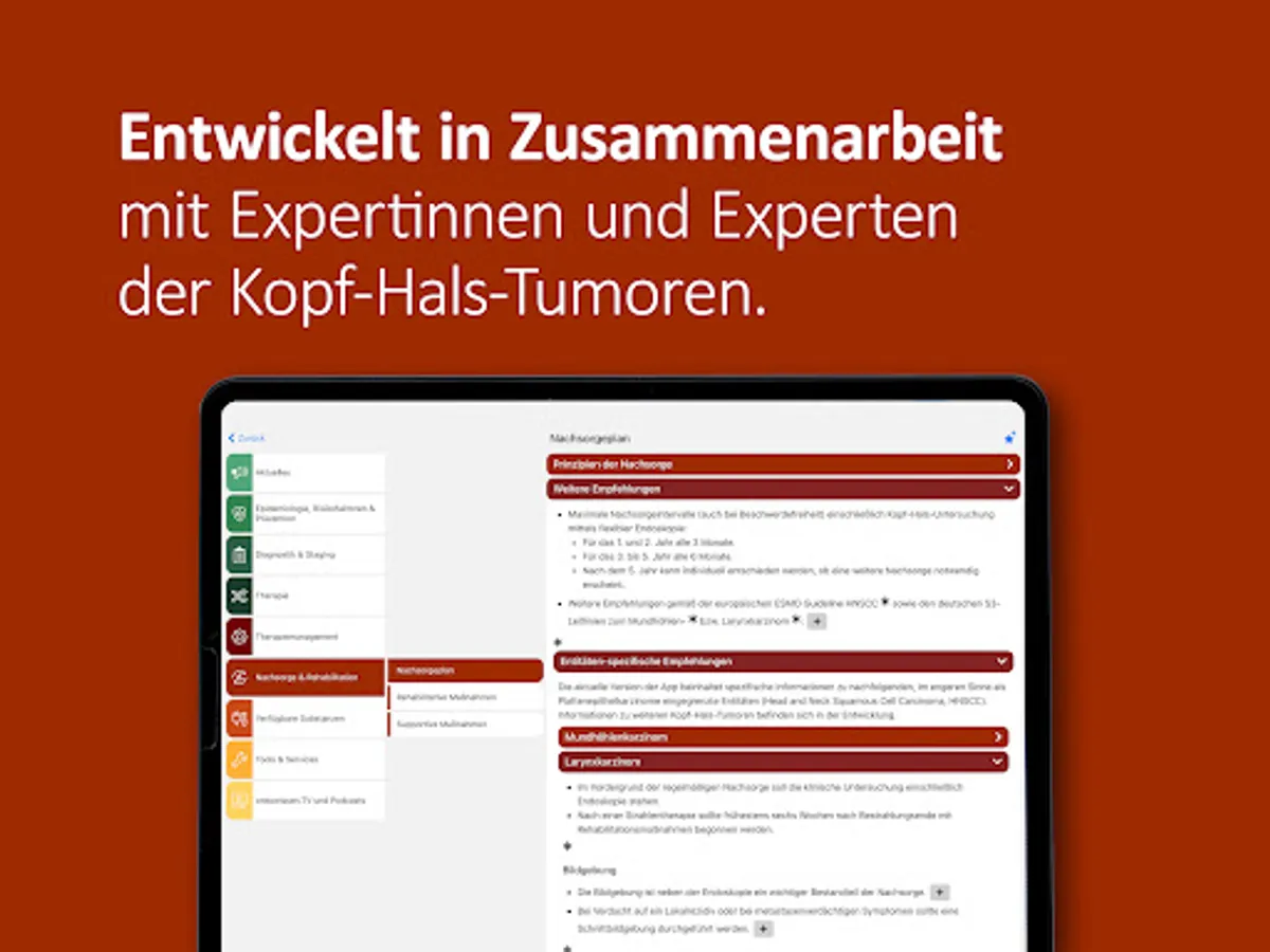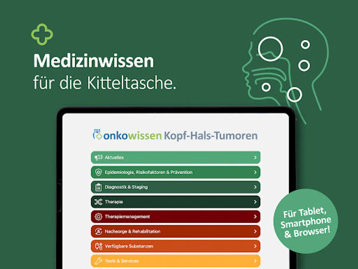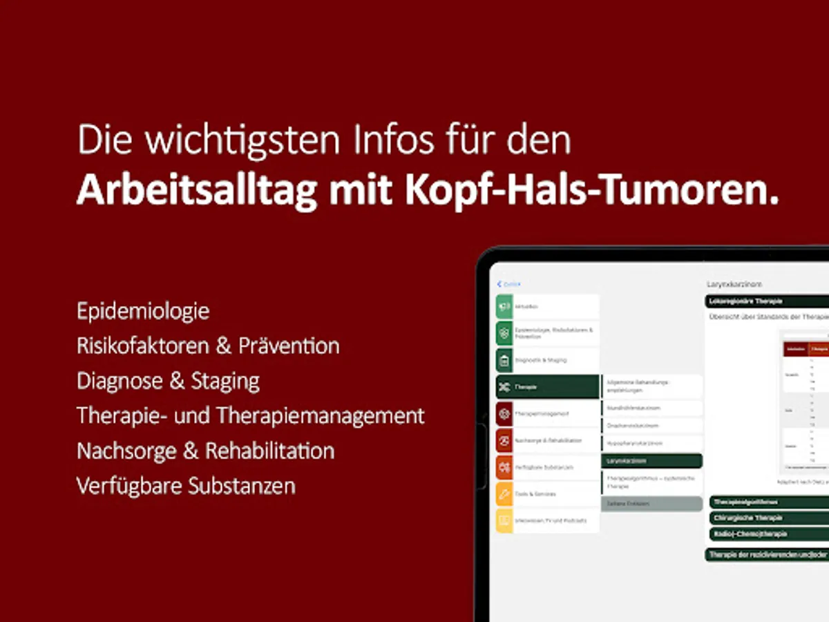This app is intended only for professionals with an onkowissen.de login. The app is intended solely as an informational basis for the treatment of head and neck cancer.