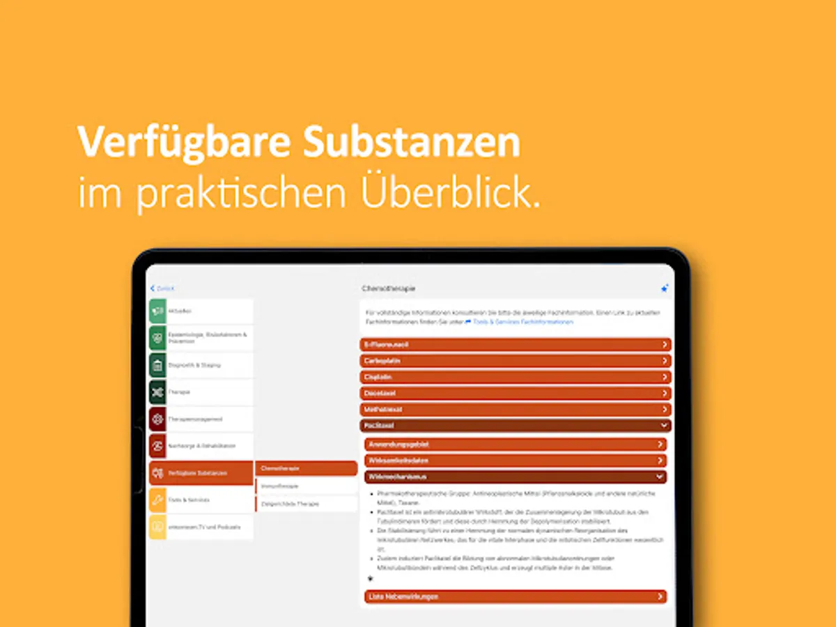 The clear representations of the therapy situations offer quick access to the current treatment options in the respective patient stage, linked to all relevant information and background to each therapy.