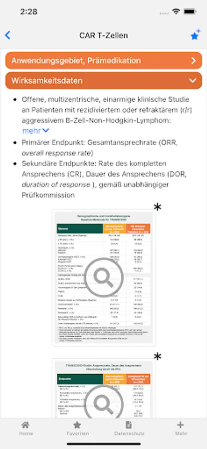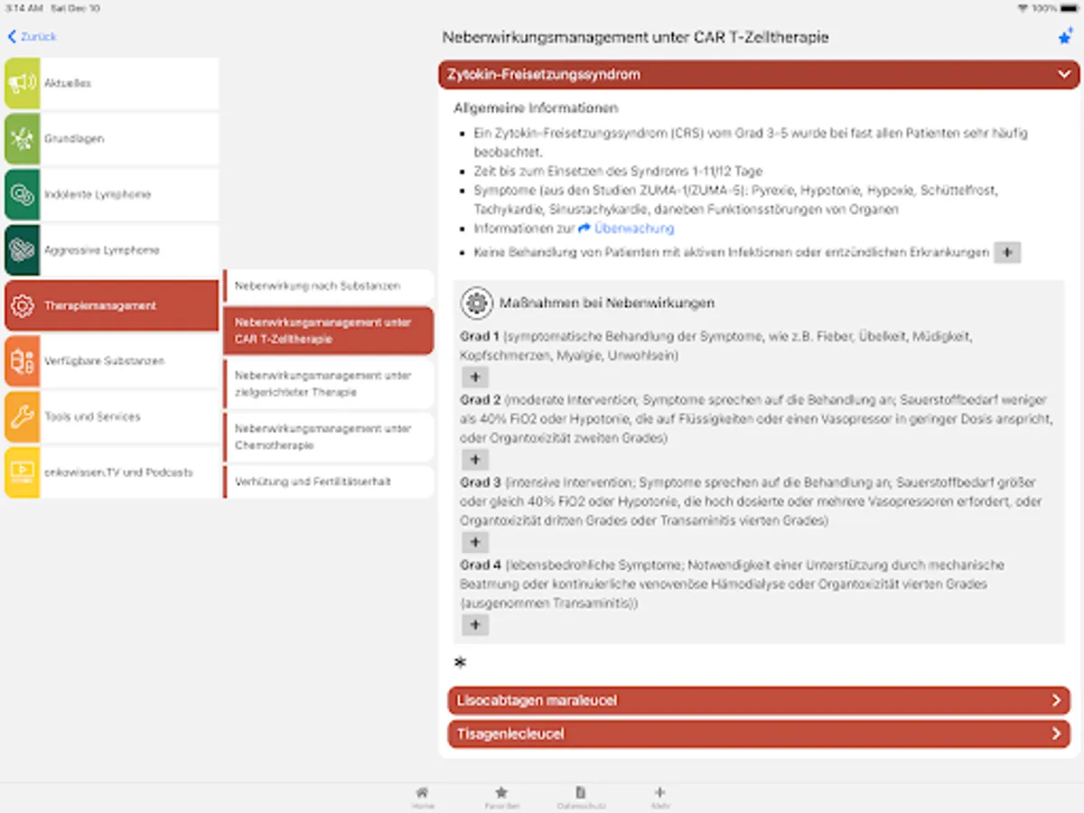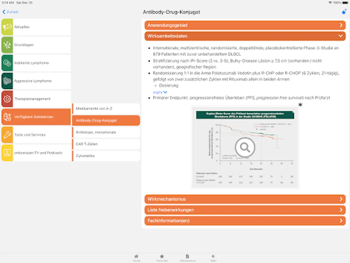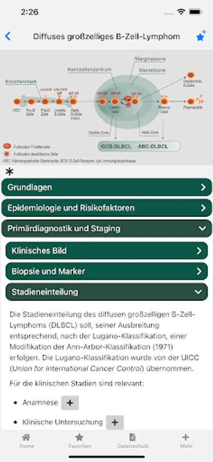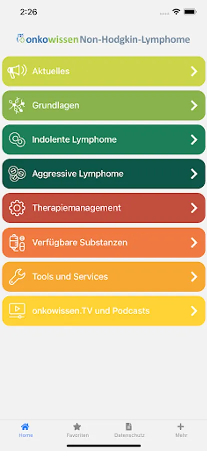 The app also contains a news feed with links to new data and current topics related to non-Hodgkin lymphoma. Under Tools and Services you will find some useful things: indices and scores used, therapy protocols, guidelines and recommendations for external content.