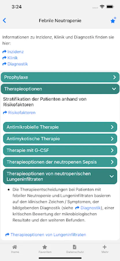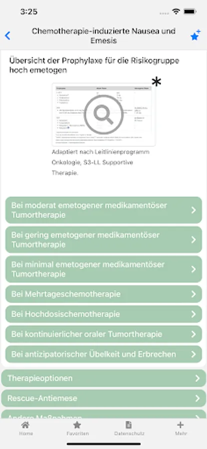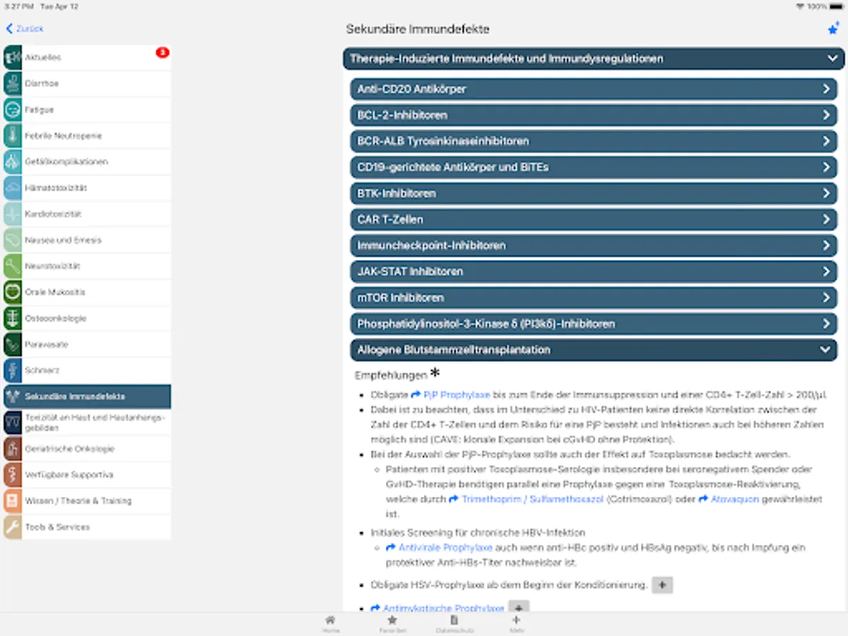 The app differentiates according to the induction of the side effect by chemotherapy and targeted substances, immuno-oncological drugs, and radiation therapy. For the respective side effects, the contents are divided into prophylaxis, therapy options and other possible measures.