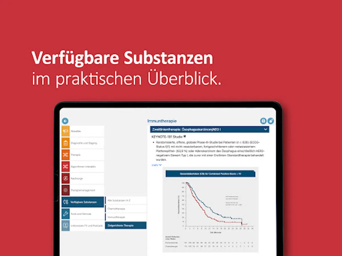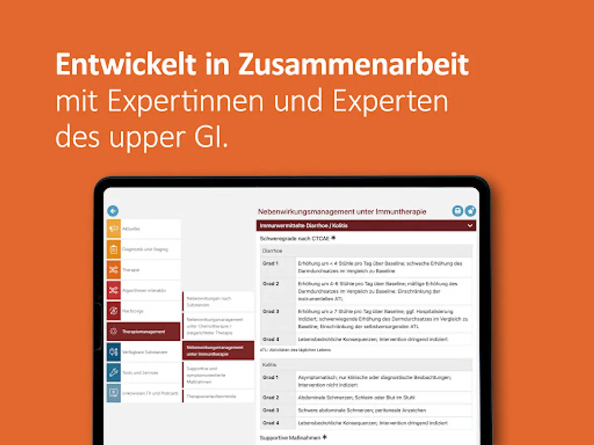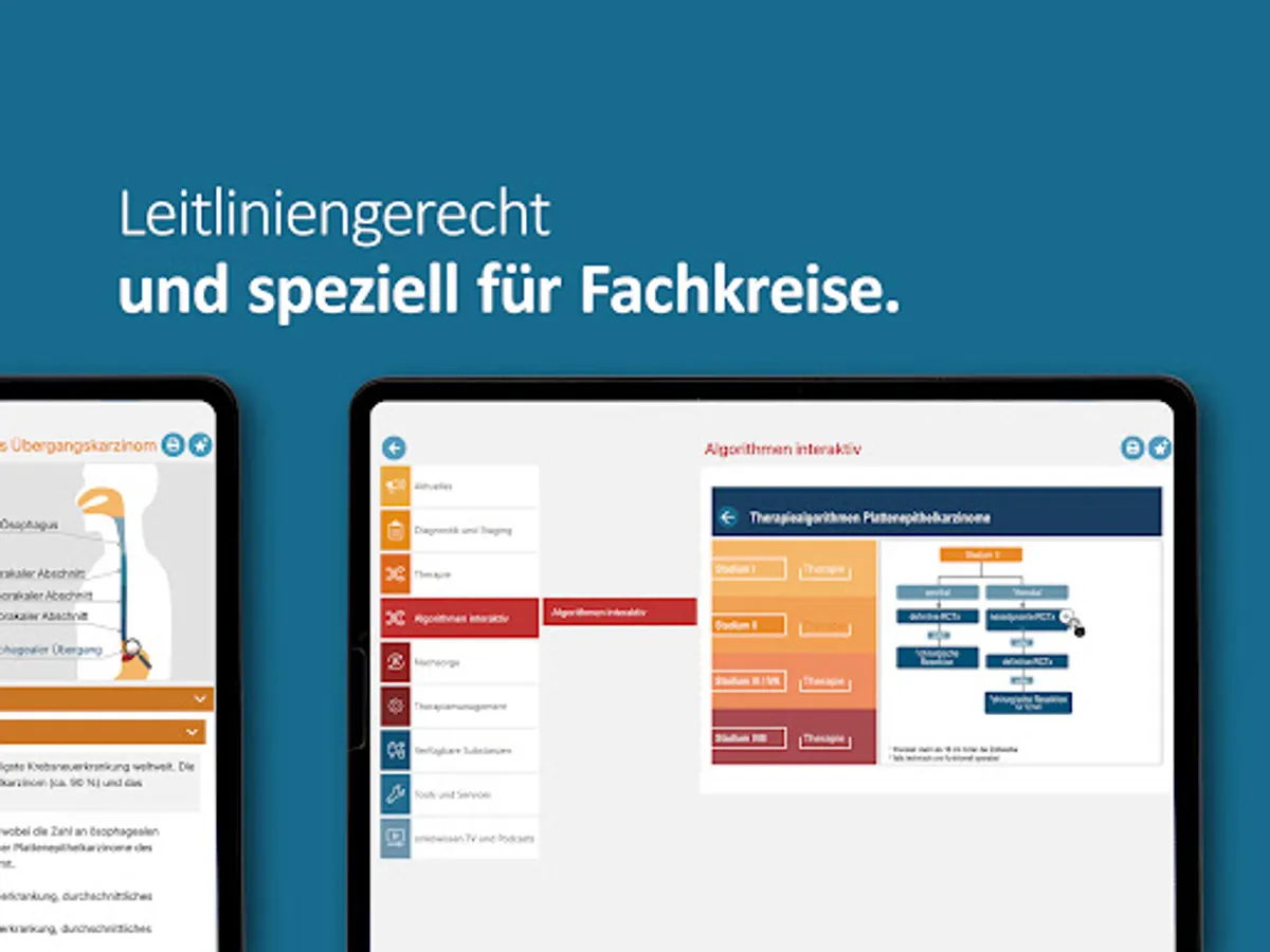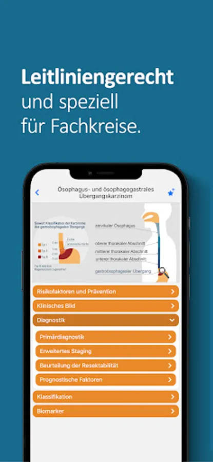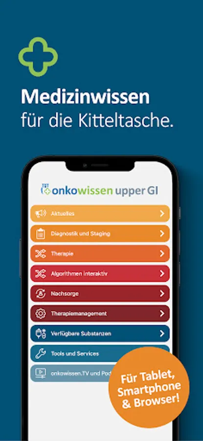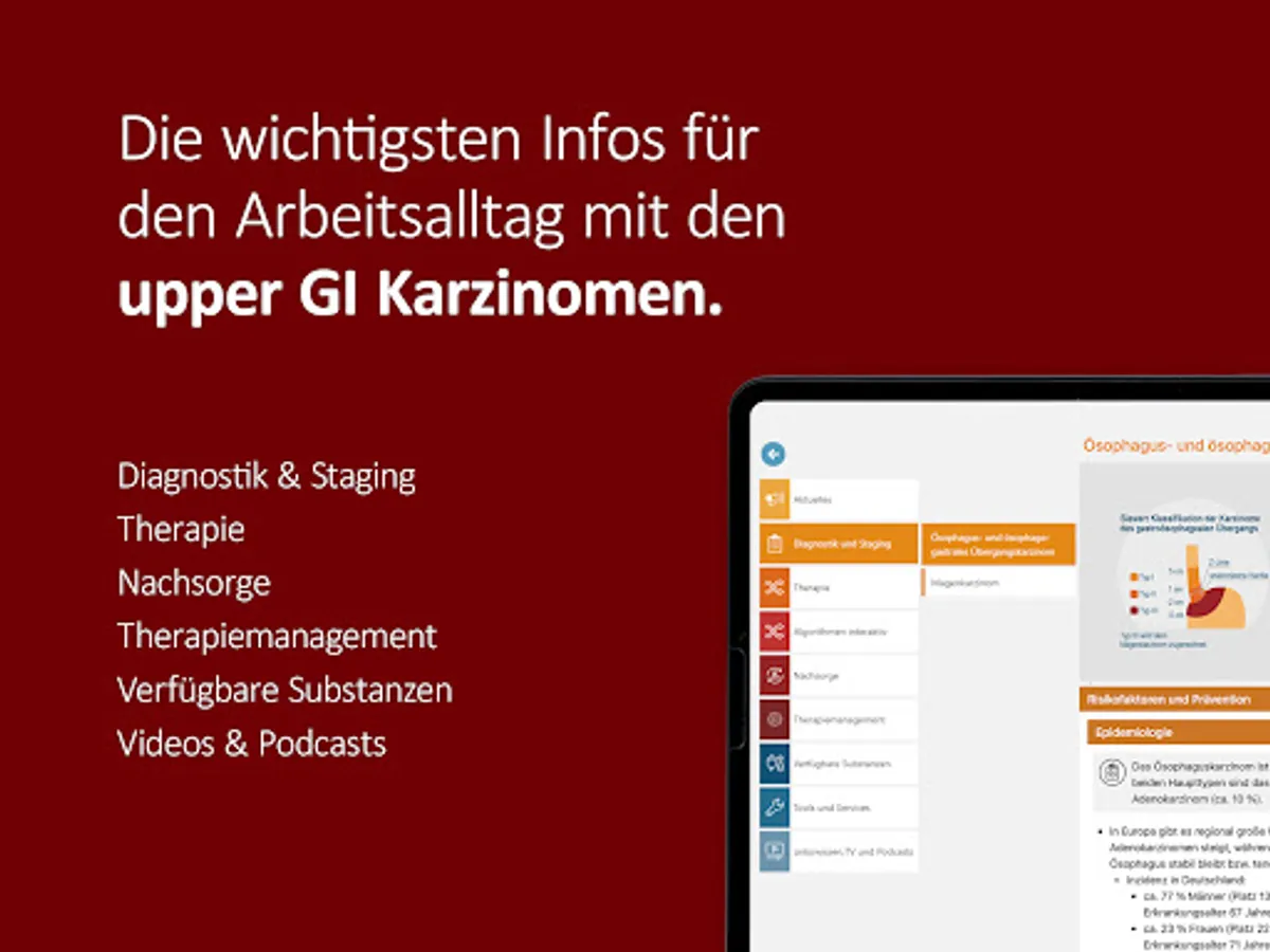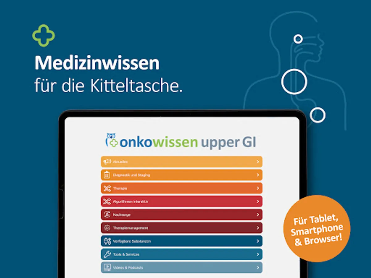 The onkowissen upper GI app offers you digital, quick, easy and up-to-date access to extensive information on the diagnosis and treatment of upper GI carcinomas. The app was developed and implemented in cooperation with medical experts. This app is intended only for professionals with an onkowissen.de login.