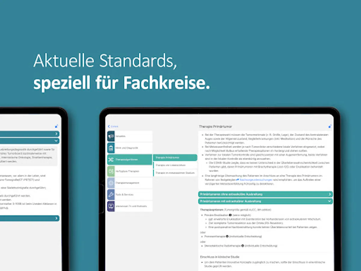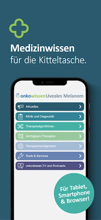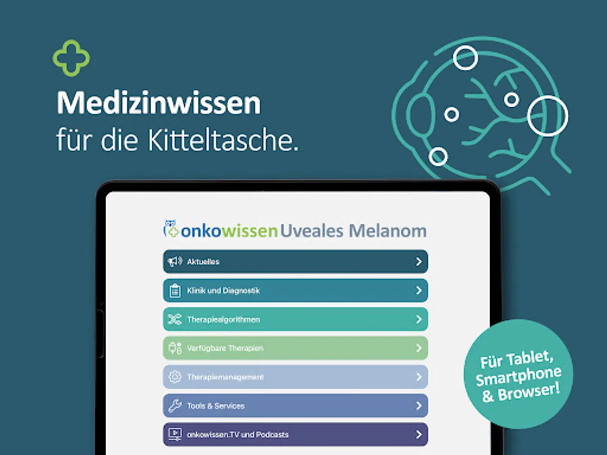 The onkowissen Uveal Melanoma app offers you digital, fast, simple and up-to-date access to extensive information on diagnostics and treatment options for uveal melanoma. The app was developed and implemented in cooperation with medical experts. This app is intended only for professionals with an onkowissen.de login.
