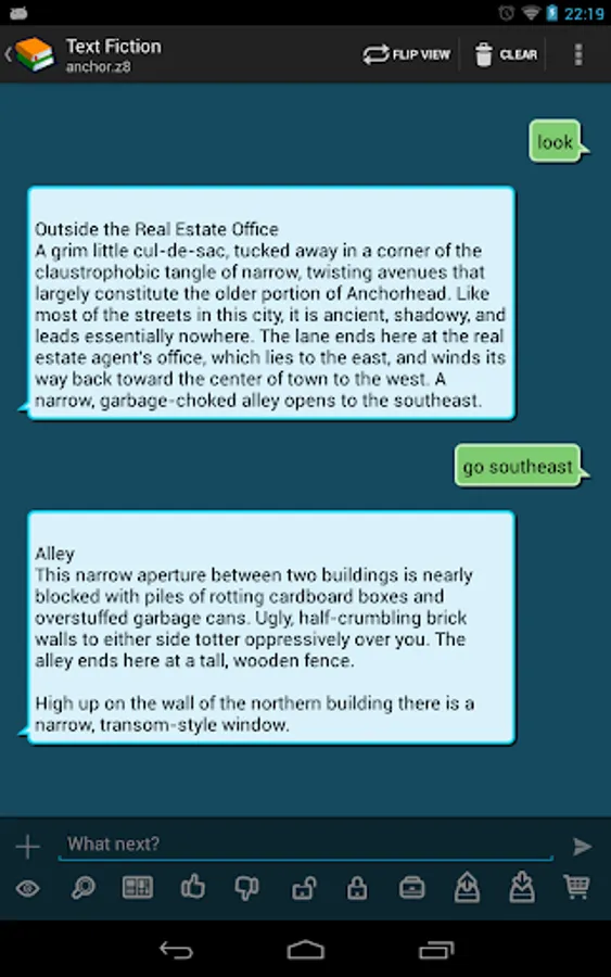 TextFiction is definitely the best adaptation of the genre available for Android. You control the protagonist through a novel SMS like interface which replaces the need for typing commands with intuitive touch controls. Users of chat apps will instantly feel at home! The barrier-free design also makes this app the perfect choice for users with disabilities.