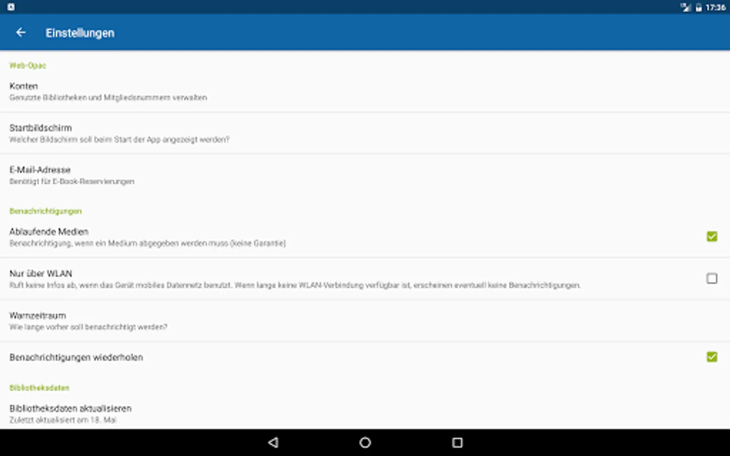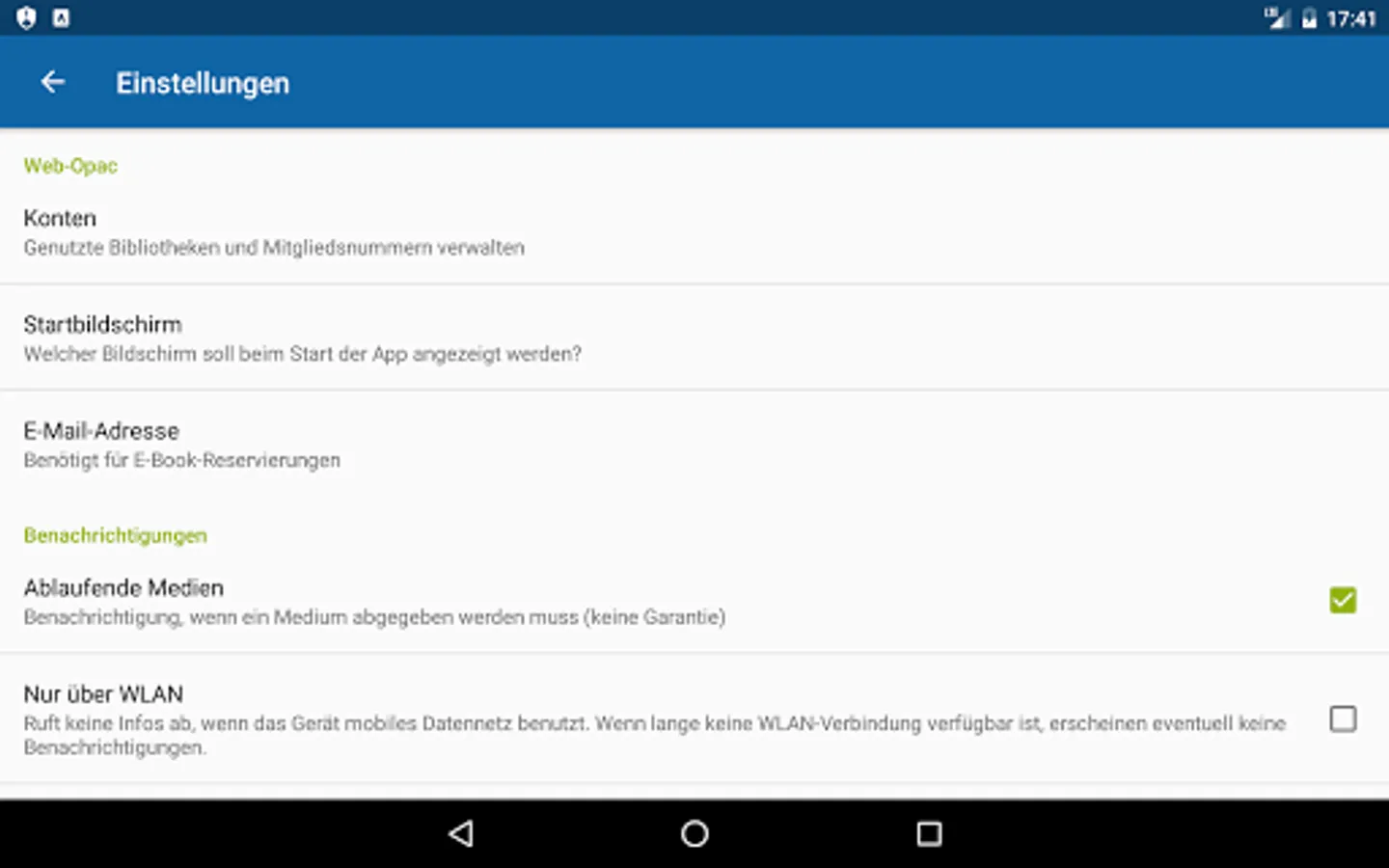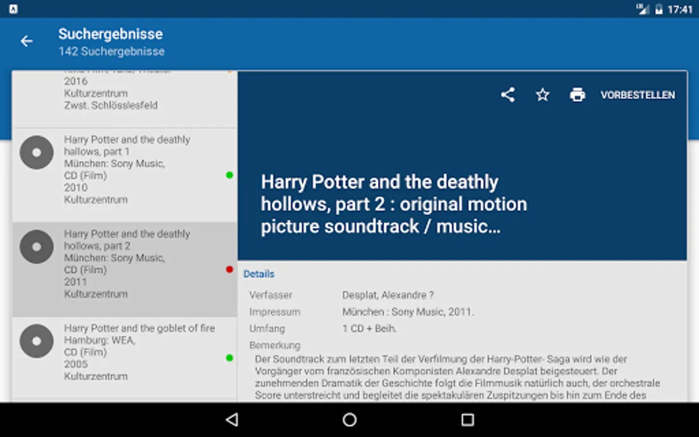 This Android app gives you easy access from the road to the catalog and the membership account of the municipal library Ludwigsburg.