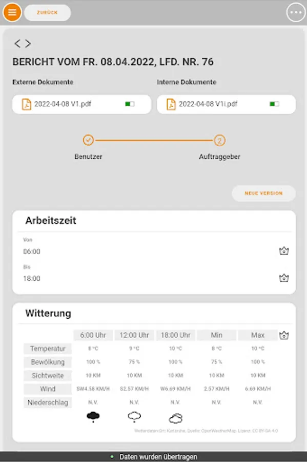 The construction diary service stands out from the other Open Experience services in particular because of the automated data transfer. For example, the inspections carried out from the construction defects service or the number of people present can be automatically adopted from the construction site ID service. The weather conditions are taken directly from online sources. This leaves very little information for the on-site employee to add.