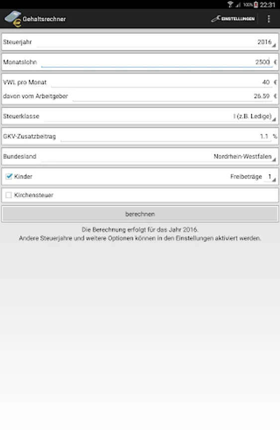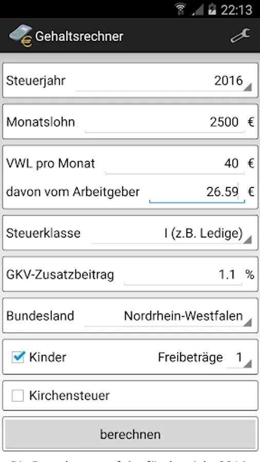 The calculation takes into account all tax-relevant parameters. These include e.g. Tax code (also with factor), children's allowances, church tax liability, special cases dependent on federal state, additional contributions to the statutory health insurance, contributions to private health insurance, social security contributions, year of birth, tax exemption amount, additional amount, etc.