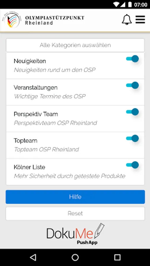 You decide which news are important to you. Choose what you what you want and get interested in a push message. To do this, click on "Select Categories". Later, you can change the selection via clicking on the bell icon at any time.