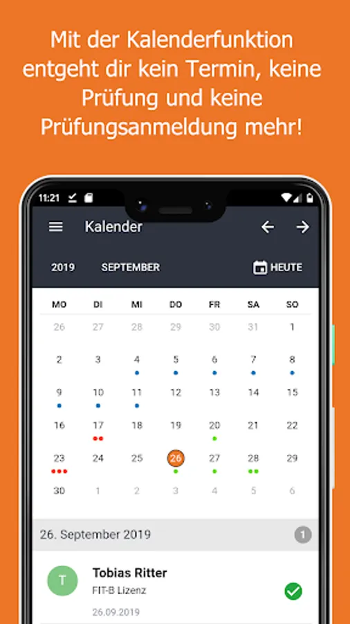 Through the clear calendar function, you can see on which day a new unprocessed registration has been received (red), on which day of the week an exam is scheduled (green) or when you can not take an exam because you are on vacation (blue).