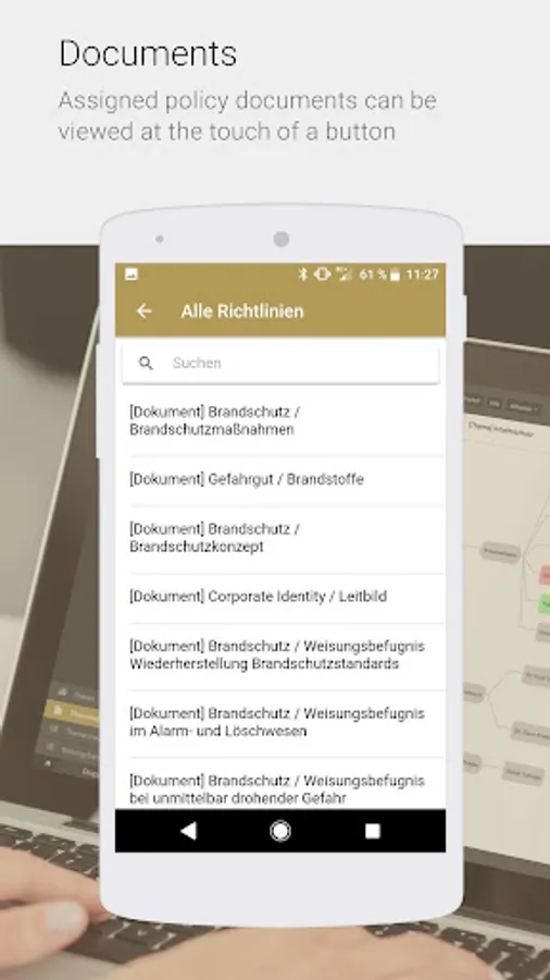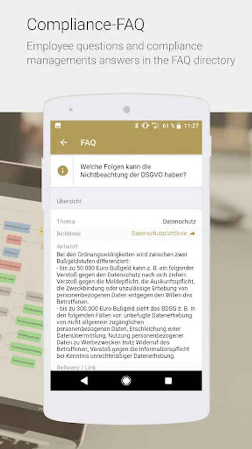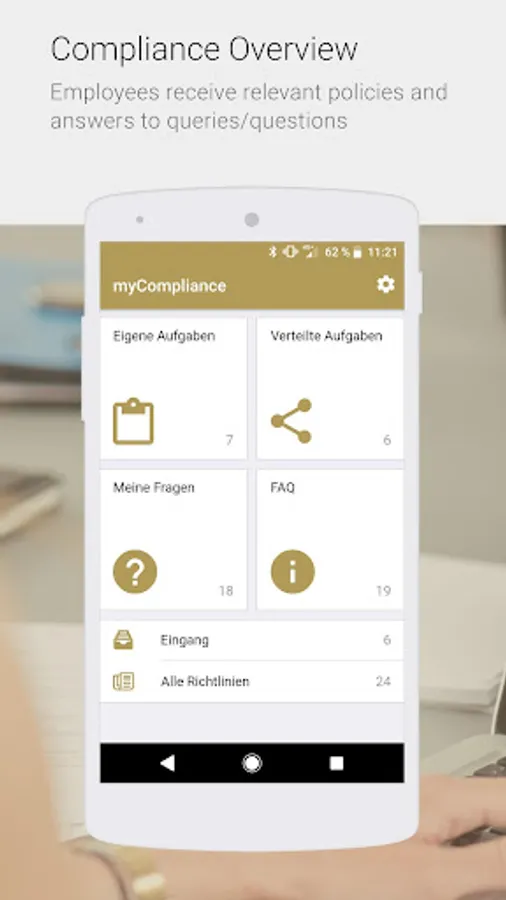 To comply with guidelines and policies employees need to have access to them. The app myCompliance simplifies the access: Employees can choose if they use their desktop-PC or a mobile device for receiving their individualized guideline information.